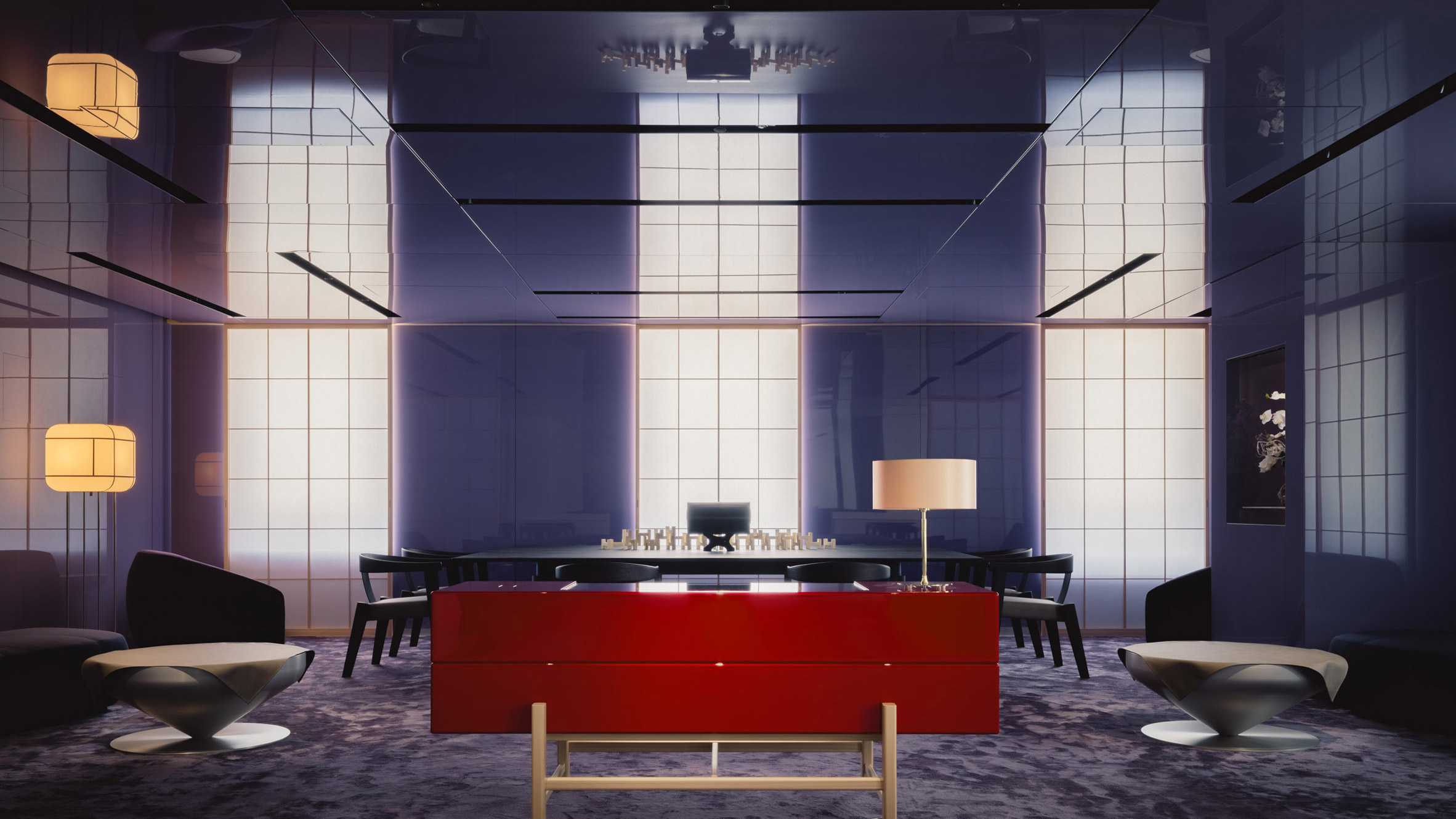 Si bien la mayoría de las paredes permanecen blancas, una habitación está empapada en un tono púrpura Edo saturado. Aquí, las delicadas mamparas shoji y las linternas de papel cuadriculado ayudan a cerrar la brecha entre los interiores japoneses tradicionales y modernos.