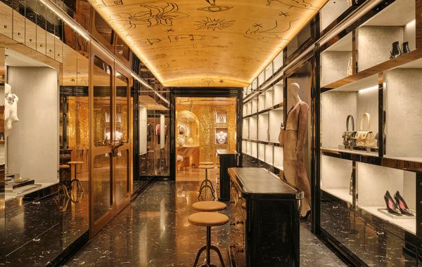 Una pirámide invertida cuelga sobre los baños y las paredes están cubiertas de travertino rayado, diseñado para evocar los restos de civilizaciones antiguas. La secuencia de entrada oscura y dramática y las áreas cambiantes igualmente atmosféricas evocan una estética más futurista.