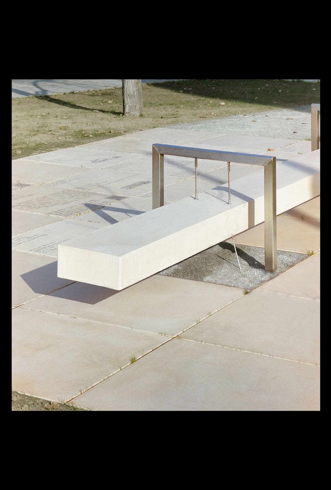 El banco es el centro de la experiencia. Proporciona un momento de descanso. En este lugar tranquilo, los visitantes pueden reflexionar sobre el trabajo de Blore. El diseño utiliza las texturas industriales circundantes para enmarcar el paisaje. FOTOGRAFÍA DE YANEP LUST Las fotografías grupales y los primeros planos de Bernáth Milanan resaltan estos detalles materiales. Verás el contraste entre las líneas nítidas de la ilustración y la naturaleza táctil del camino conmemorativo.