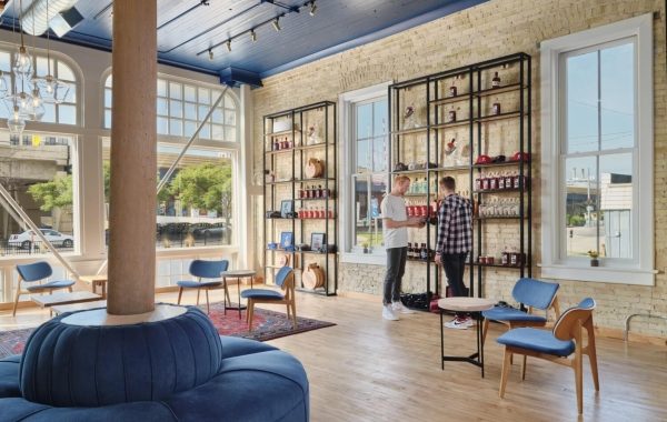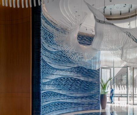 Blue Voyage, una de las instalaciones arquitectónicas de cerámica impresa en 3D más grandes del mundo, guía a los huéspedes del hotel hacia el interior a través de su presencia escultórica y su geometría relajante.