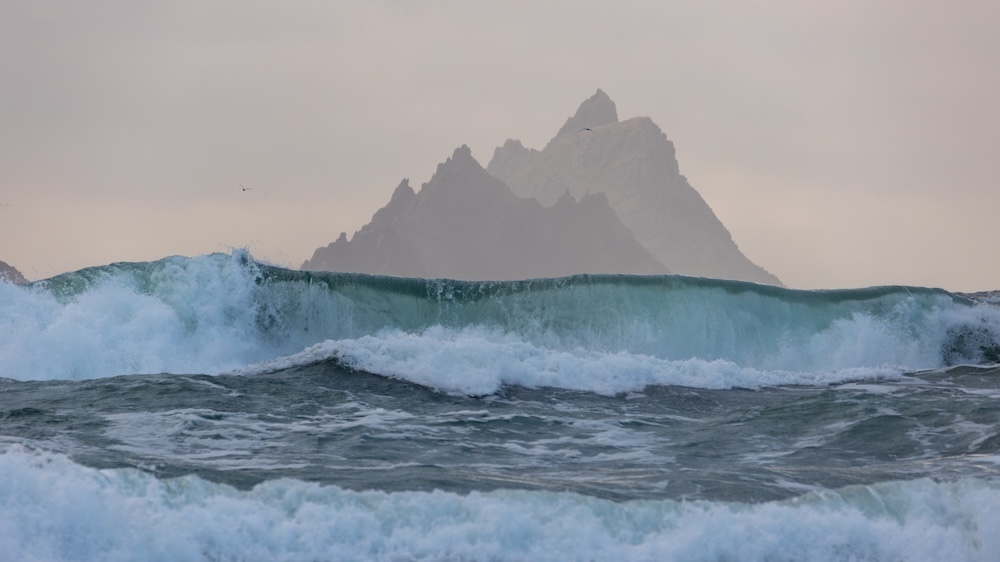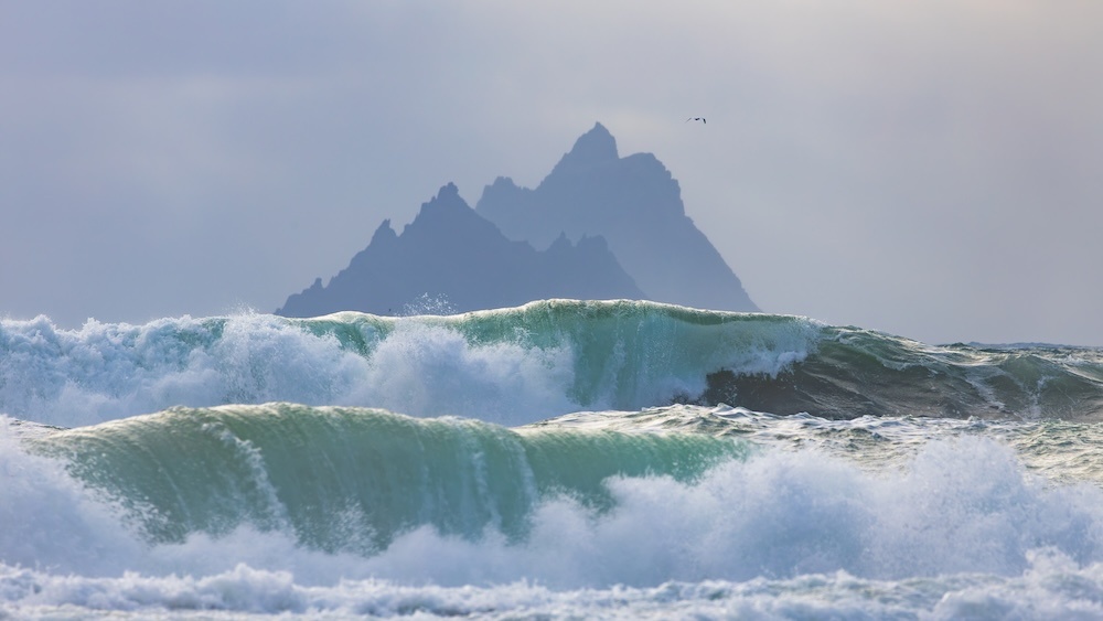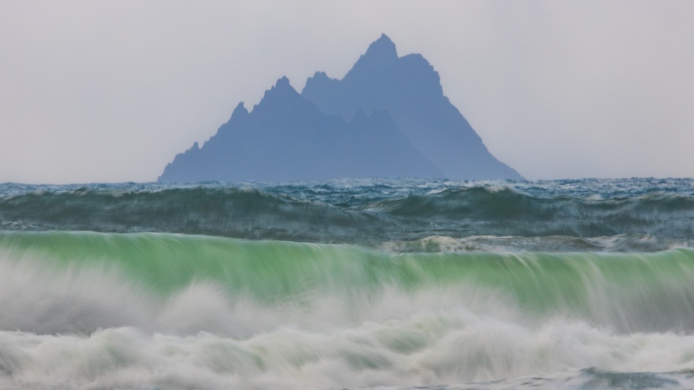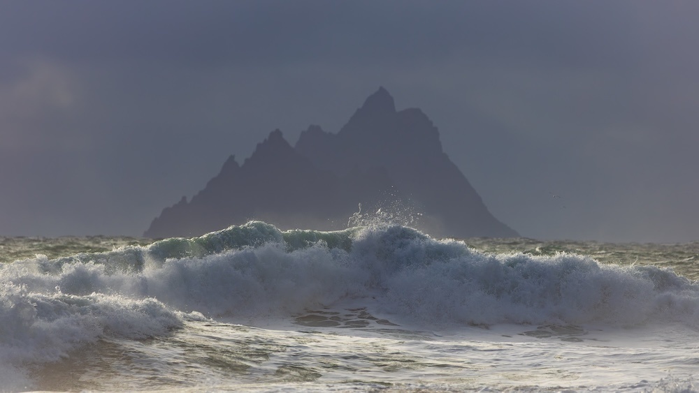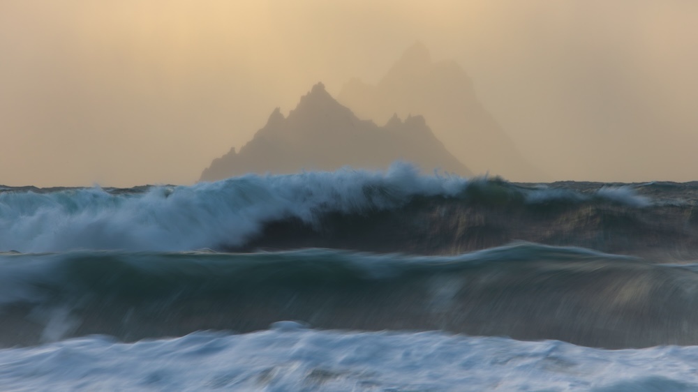 Al final, la lente me permitió atraer las olas directamente hacia las islas Skellig. Se reduce la distancia entre el sujeto y el fondo. De repente, el tiempo es más importante que nunca. No esperé una situación general, sino un momento específico: una única ola subiendo, rompiendo y alineándose con la isla detrás.