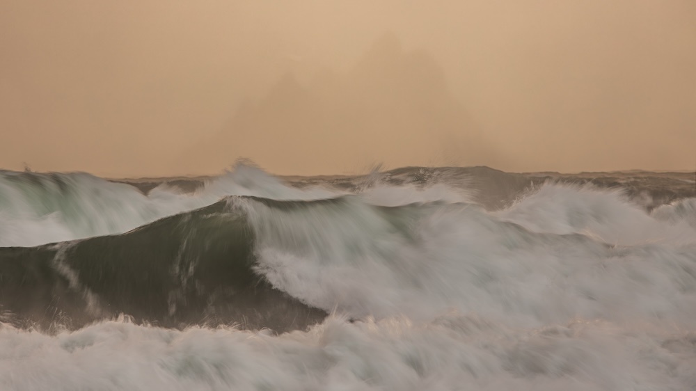 Ahora, a pesar de la advertencia de clima “severo”, sabía que al menos podría tomar algunas fotos; todo lo que necesitaba eran las olas para capturar las imágenes “de mal humor”. Lo que quería era luz, y ese día, la luz estaba cambiando rápidamente, lo que significaba que necesitaba ser receptivo en mi enfoque. Mi composición no cambió mucho; Los principales ajustes fueron mi enfoque. Centrarse en las islas significaba que serían nítidas; sin embargo, incluso si enfocaba al infinito, todavía no podía mantener claras las olas en la toma. Observo las olas romper y trato de predecir dónde debo concentrarme para atraparlas lo más claramente posible. Mientras las olas se curvaban entre la isla y yo, varié la velocidad de obturación para congelar el agua en movimiento. Considerándolo todo, claro, me perdí algunas tomas, pero las tomas que hice bien son algunas de mis tomas favoritas que he tomado, y solo fueron posibles gracias al alcance de esta lente.