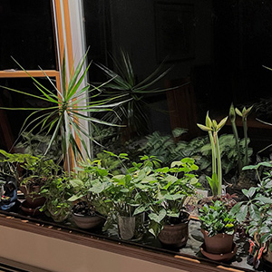 Plantas de interior frente a la ventana por la noche.Es el hábitat perfecto para este grupo de plantas, muchas de ellas con follaje abigarrado o colorido, y amarilis como regalo anual.