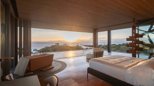 Cada pared personalizada, de aproximadamente 19 pies de alto y 30 pies de largo, evoca el movimiento fluido del Golfo Arábigo en forma arquitectónica, creando un umbral espectacular para los huéspedes del hotel.