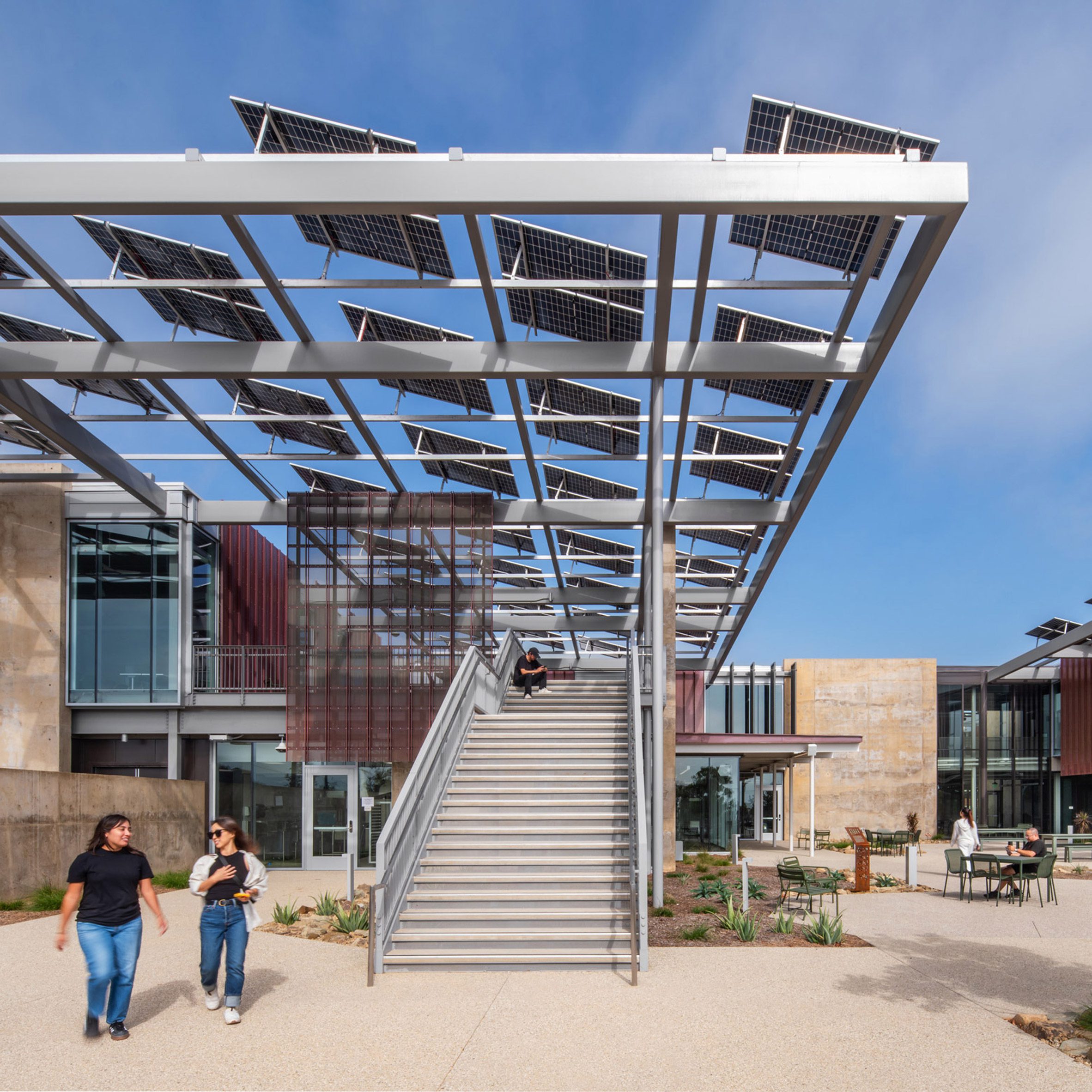 Los edificios están rematados con marquesinas colgantes que proporcionan sombra y albergan paneles fotovoltaicos. Los paneles ayudan a generar electricidad para la escuela, que afirma tener energía neta cero.