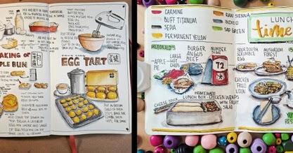 Revista así como cuadernos de bocetos y pinturas, incluidos arte de la comida y lugares de interés.