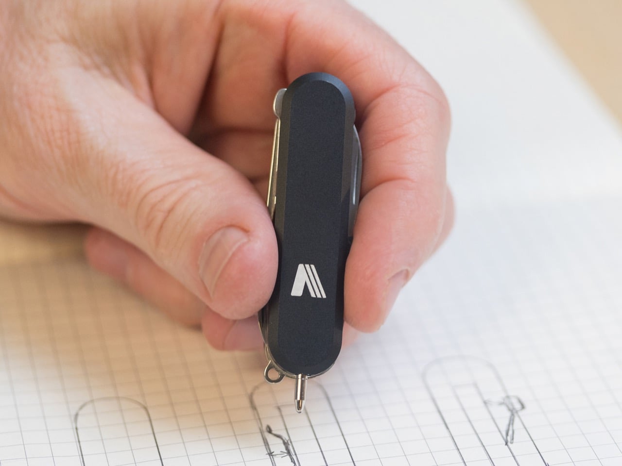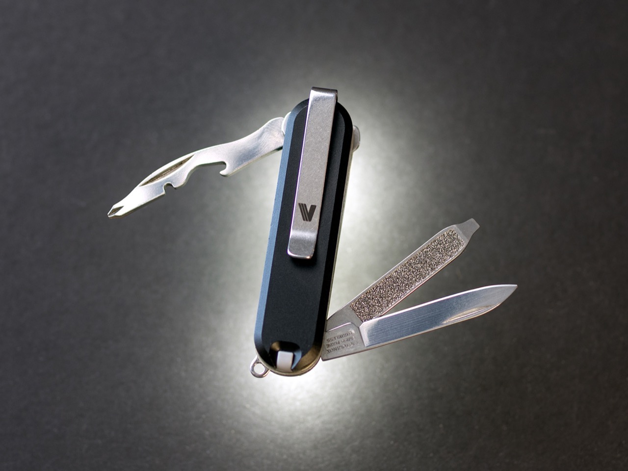 De la primera ola de módulos, Clip Scale es probablemente el más famoso. Está mecanizado a partir de aluminio 6061 o titanio de grado 5 y, en última instancia, agrega un clip de bolsillo limpio y de bajo perfil al SAK de 58 mm. Esta ha sido una petición común de la comunidad EDC durante muchos años. Fundamentalmente, el clip está diseñado para ser reversible y no interferir con el llavero del cuchillo, un defecto común en algunas soluciones del mercado de accesorios. Cuenta con una escala en V en el frente, que incluye una ranura multiuso diseñada para acomodar los palillos o pinzas del SAK original, lo que garantiza que no pierda la funcionalidad principal.