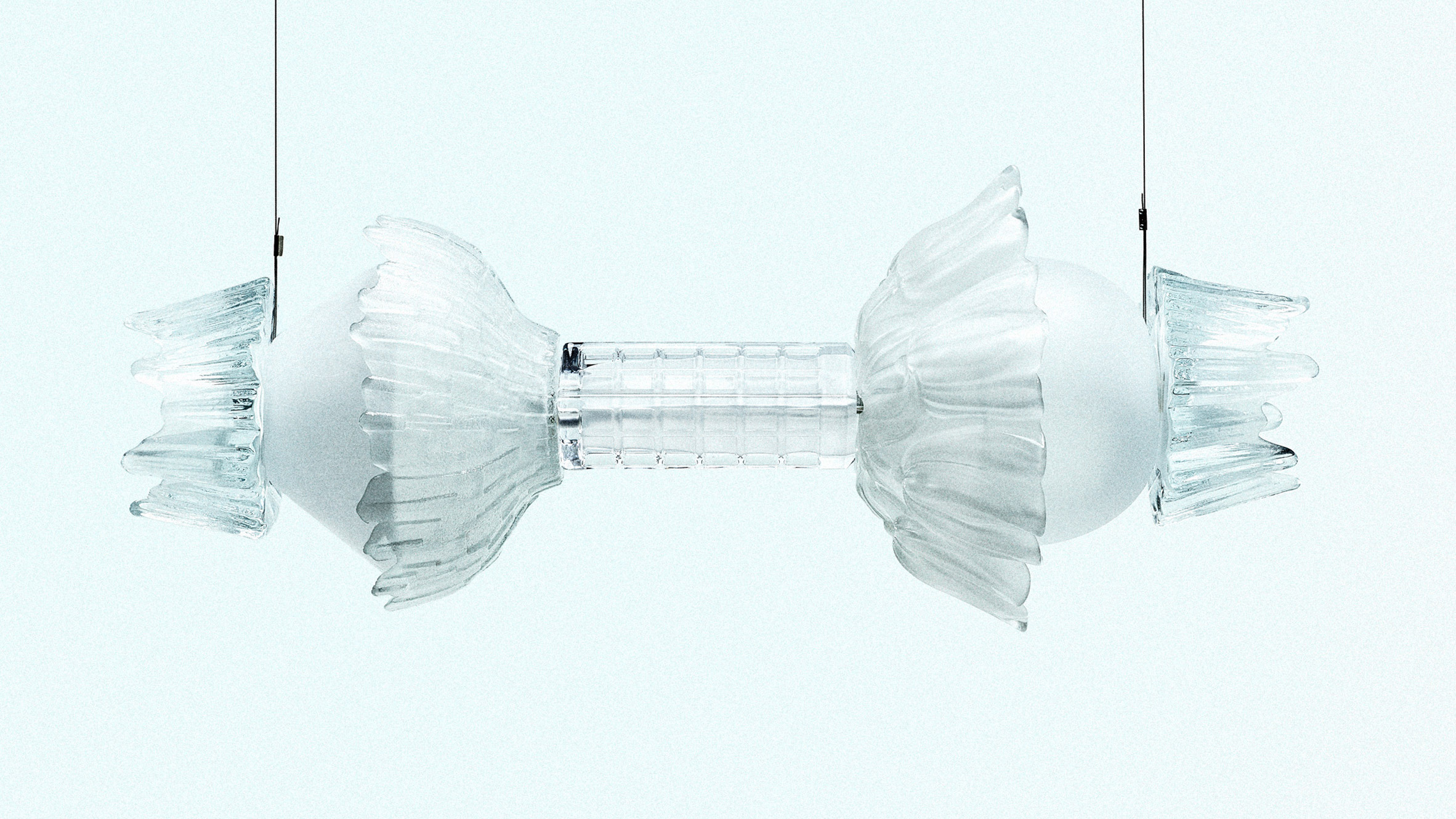 Las lámparas son parte de la actual serie Buké de Skinner, en la que reutiliza la cristalería tradicional familiar y la combina en formas inesperadas.