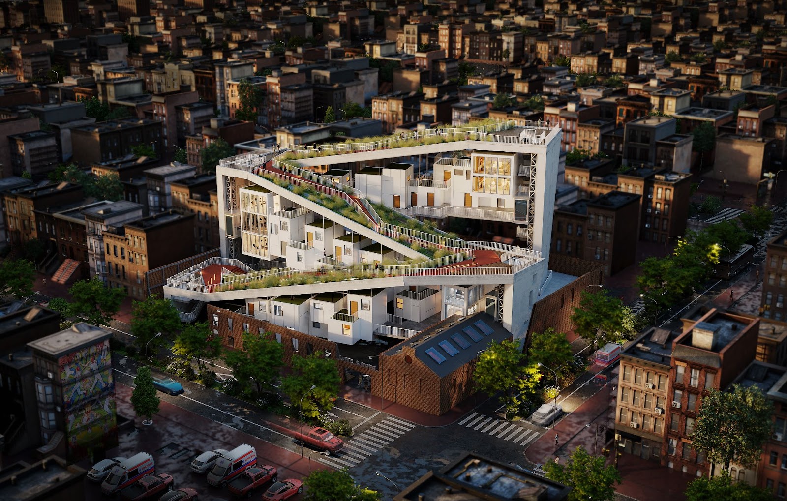 El edificio se concibe como vivienda de transición, utilizando la forma para expresar que la recuperación es un proceso gradual y visible. Su masa se extiende hacia el horizonte de Filadelfia, creando vistas a menudo invisibles para quienes viven en las calles y convirtiendo la ciudad misma en una fuente de poder. Una rampa continua se eleva desde el suelo hasta la cubierta, sirviendo a la vez de canal de circulación y paseo público. Este camino inclinado invita a movimientos lentos, momentos de pausa y encuentros compartidos, haciéndose eco de los esfuerzos necesarios para reconstruir la estabilidad. A medida que los residentes crecen, la ciudad se abre a su alrededor, mejorando la sensación de progresión espacial. El edificio prioriza la apertura y la accesibilidad, utilizando rampas como gesto cívico para conectar el refugio, la vida pública y las aspiraciones en un único viaje espacial.