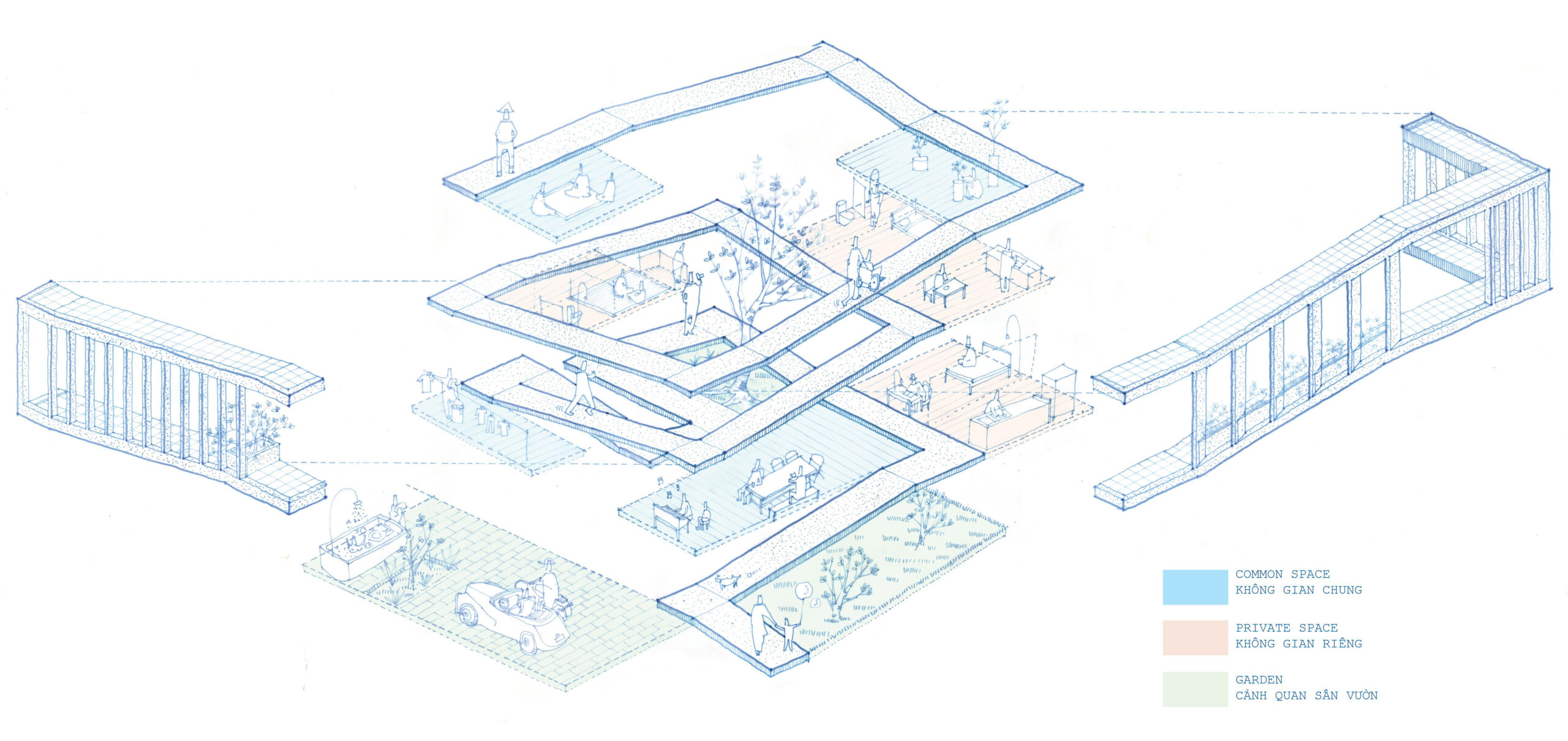 La casa está situada en un sitio costero empinado y se organiza alrededor de una rampa continua, reemplazando a las escaleras como principal medio de vida diaria. La rampa sigue la pendiente natural del terreno, comenzando desde el patio delantero, rodeando un patio ajardinado y subiendo gradualmente hasta un balcón con vistas al mar. Su suave pendiente favorece el acceso de sillas de ruedas y al mismo tiempo fomenta el movimiento lento y concentrado en lugar del esfuerzo físico. La rampa también regula el clima: dirige el agua de lluvia hacia afuera, capta la brisa y filtra la luz del sol a través de parasoles de hormigón y lamas verticales. La superficie de piedra lavada protege contra los efectos del aire del océano y suaviza el calor y el sonido. La circulación se convierte en una experiencia vivida que conecta cuidado, clima y paisaje a través de un camino único y mensurable.