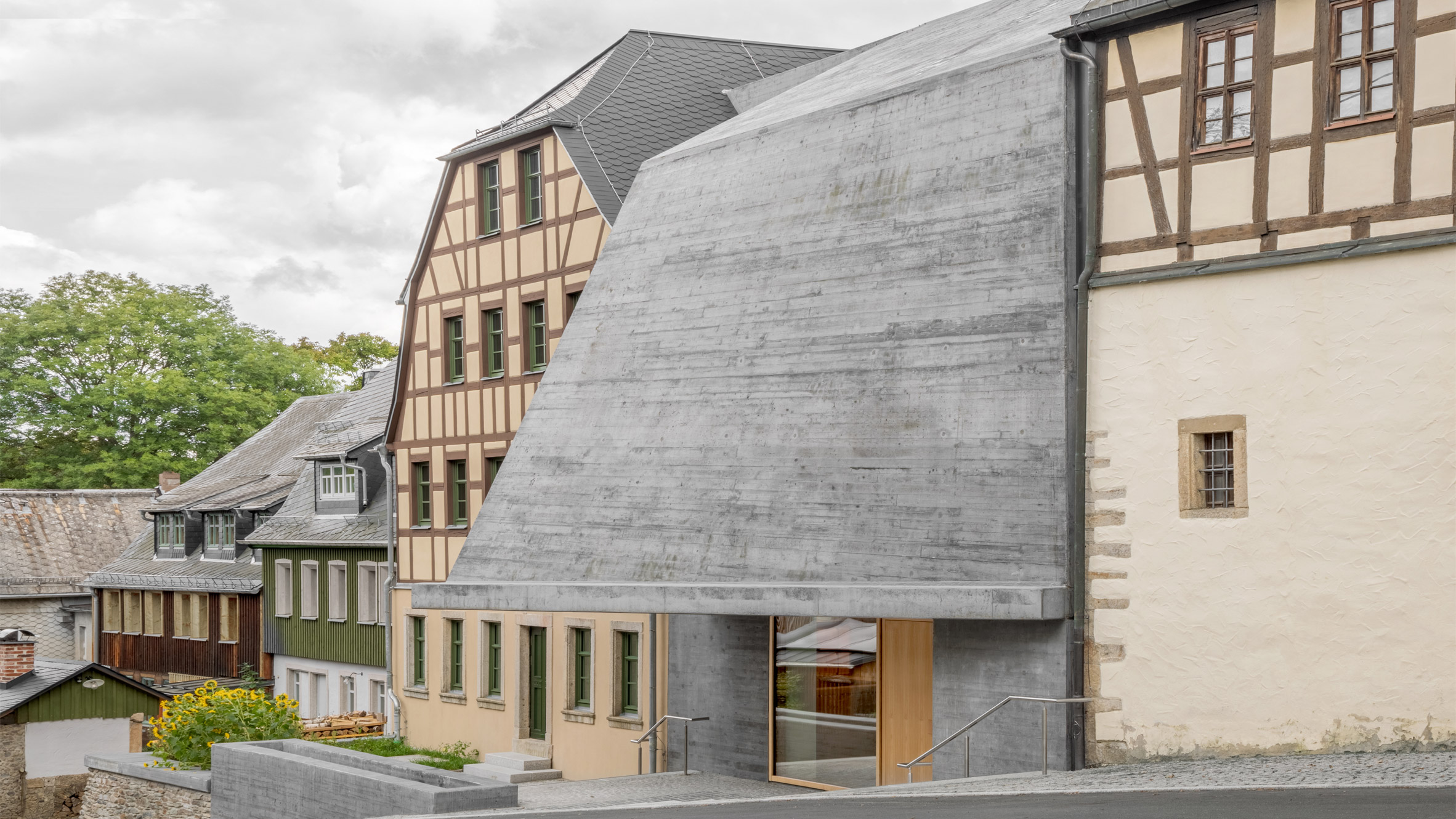 En marcado contraste con sus vecinos con entramado de madera, el volumen de hormigón tiene una fachada angular y saliente con un canal que dirige el agua de lluvia hacia la fuente de agua.