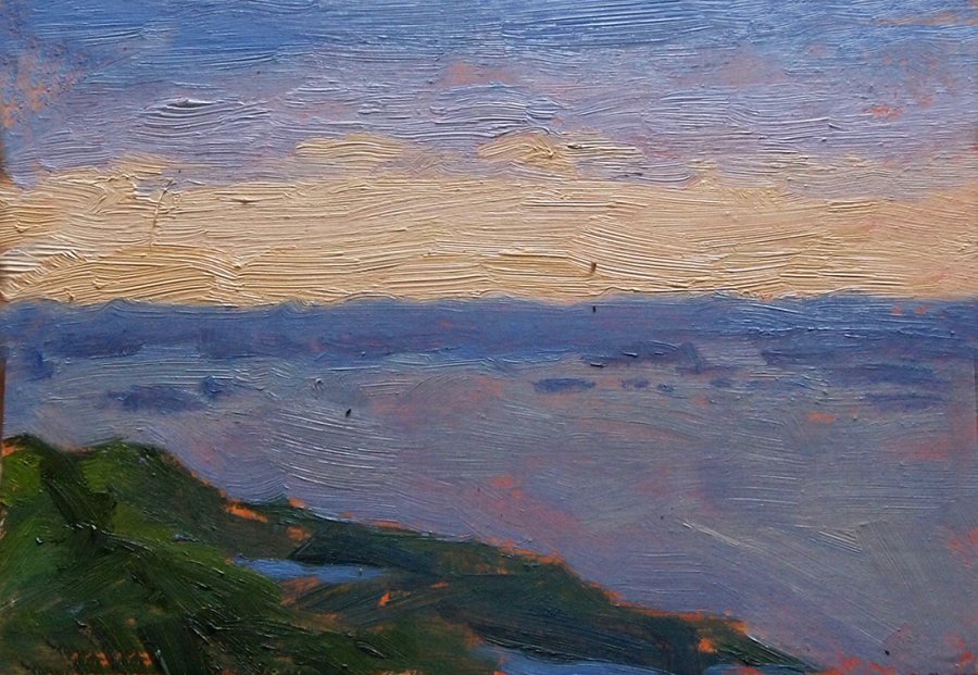 Publique tres atardeceres locales pintados durante el mismo atardecer en una sesión de pintura. Giro el caballete unos 30 grados hacia la siguiente pieza para que la vista no se vuelva aburrida.