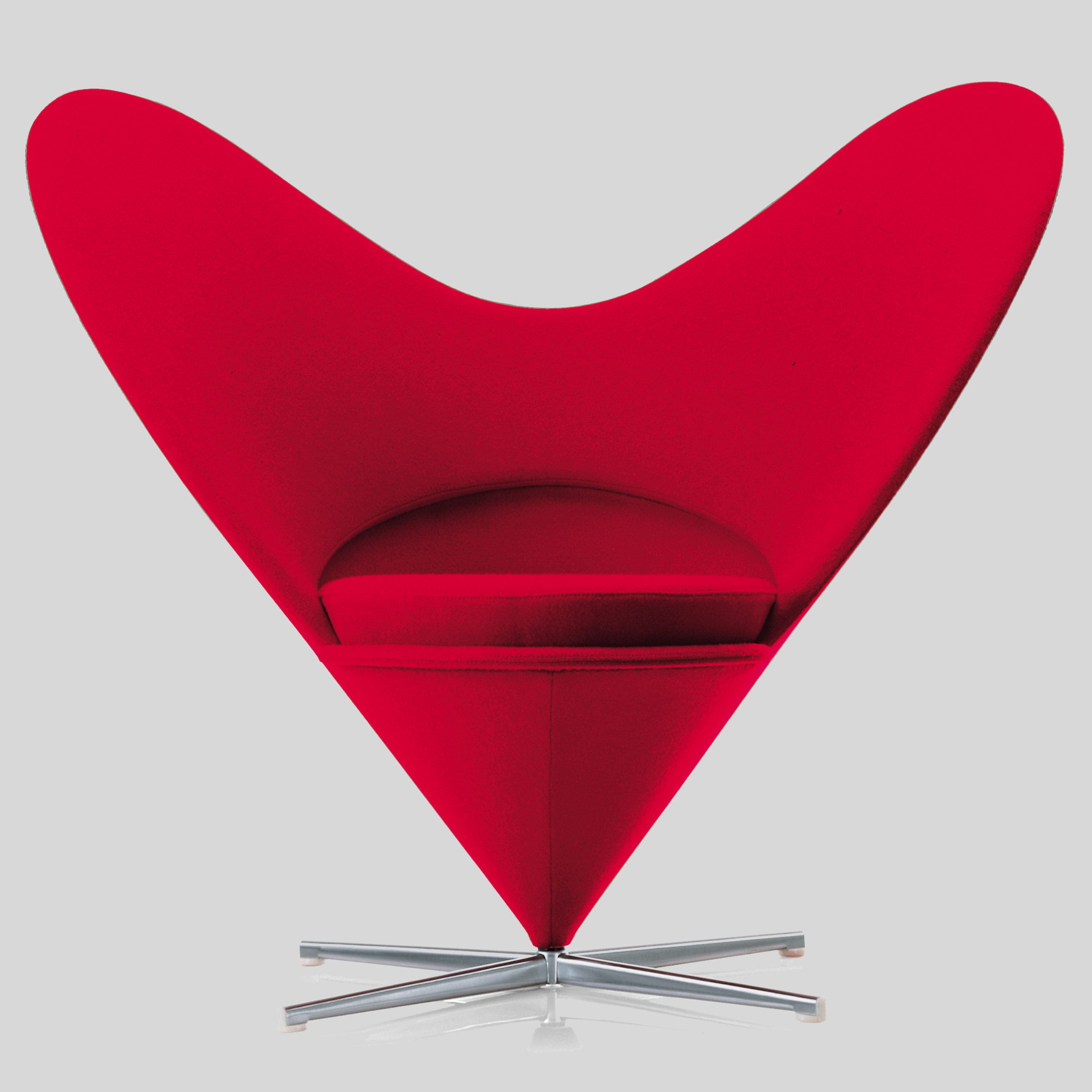 La silla Heart Cone causó revuelo a finales de la década de 1950 con su exclusivo asiento tapizado en forma de corazón sostenido por una base de acero inoxidable con acabado satinado.