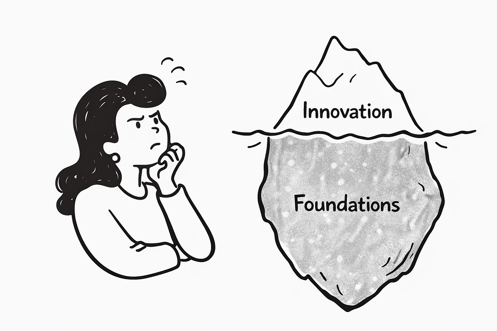 Como nos muestra el Innovation Iceberg, el enfoque de una empresa hacia la innovación abarca múltiples niveles e impacta directamente en los productos. Los productos también deben tener una base sólida para garantizar una gestión y escalabilidad adecuadas.