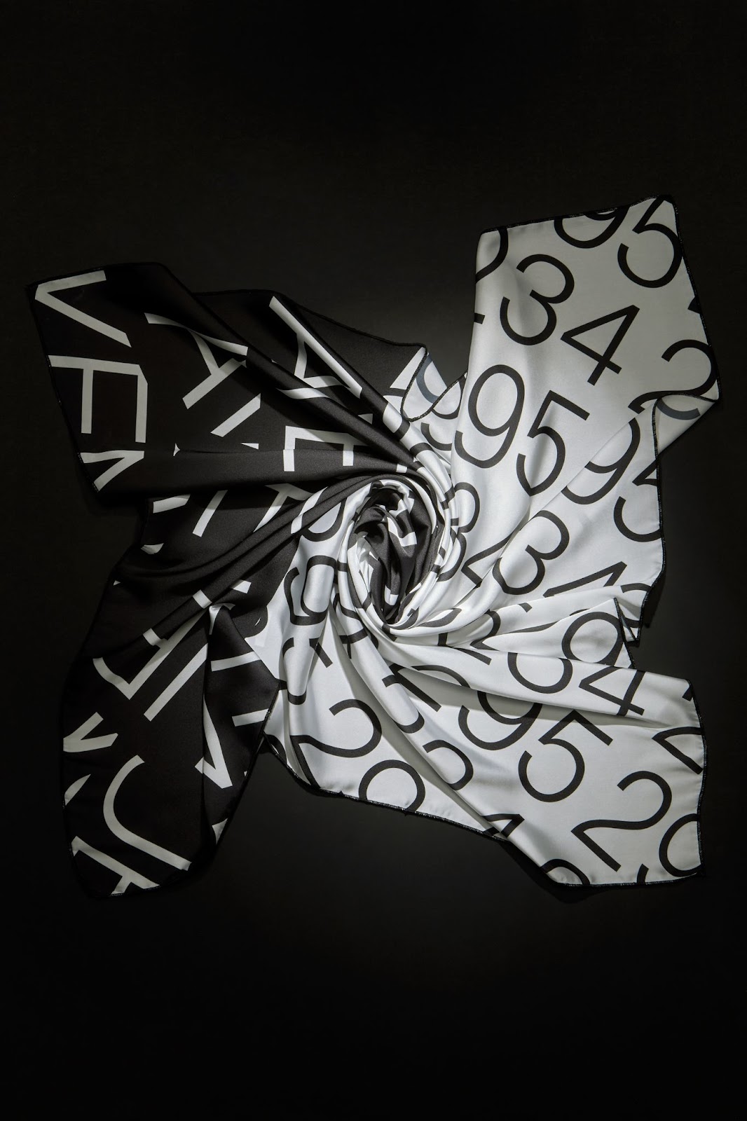 Vista detallada de la tipografía experimental en un pañuelo de seda diseñado por Alexandros Katakalos, que presenta letras retorcidas y estiradas en el pañuelo. Composición abstracta con tipografía experimental de números y letras superpuestas, imitando caminos humanos fluidos. Los pañuelos de seda cuelgan, mostrando cómo los pliegues transforman la tipografía experimental en mapas dinámicos de movimiento. Un primer plano del proyecto de tipografía experimental