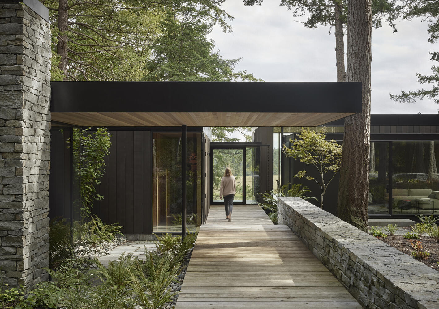 Por respeto a los edificios agrícolas de principios de siglo que ya se encontraban en el lugar, la casa se colocó cuidadosamente para que pareciera una extensión natural de la historia de la tierra. Muros bajos de piedra natural apilada organizan la estructura y marcan sutilmente los bordes de un patio lleno de pastos y helechos nativos. Las habitaciones están entretejidas entre cedros y abetos maduros, creando la sensación de que el bosque siempre fue parte del plan.