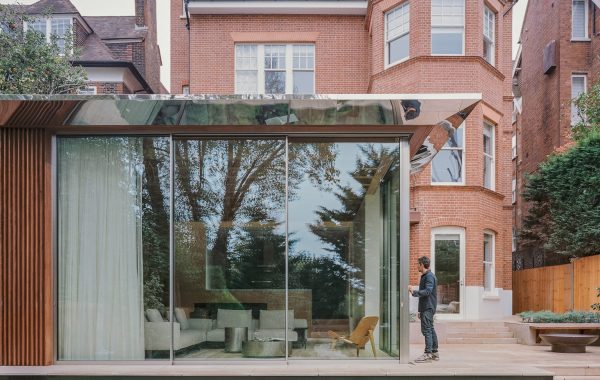 Grandes puertas plegables de cristal abren toda la esquina de la fachada, permitiendo que los suelos de piedra continúen hasta las terrazas y la disposición estrictamente rectangular de las tablas de topiario. La estricta geometría de las paredes y el pavimento contrasta con los reflejos del agua y el movimiento de los árboles, todo lo cual crea una tensión entre la forma fija y el contexto en constante cambio.