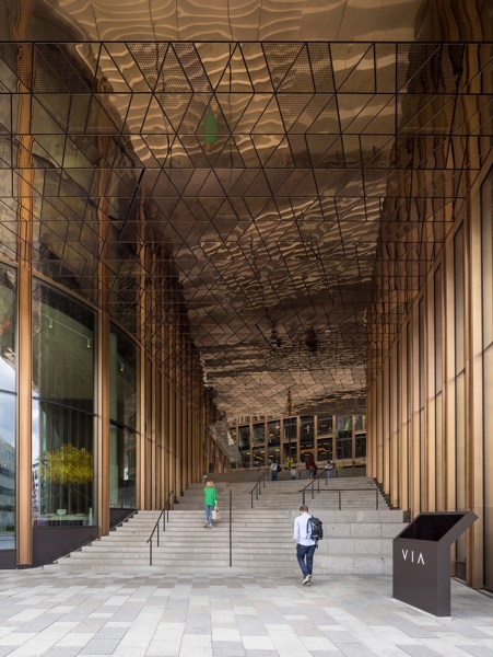 Completado en 2021 por Perkins&Will en asociación con la firma local Schmidt Hammer Lassen, VIA Oslo transforma un edificio comercial existente en oficinas modernas, áreas comerciales y un patio de comidas semisubterráneo.