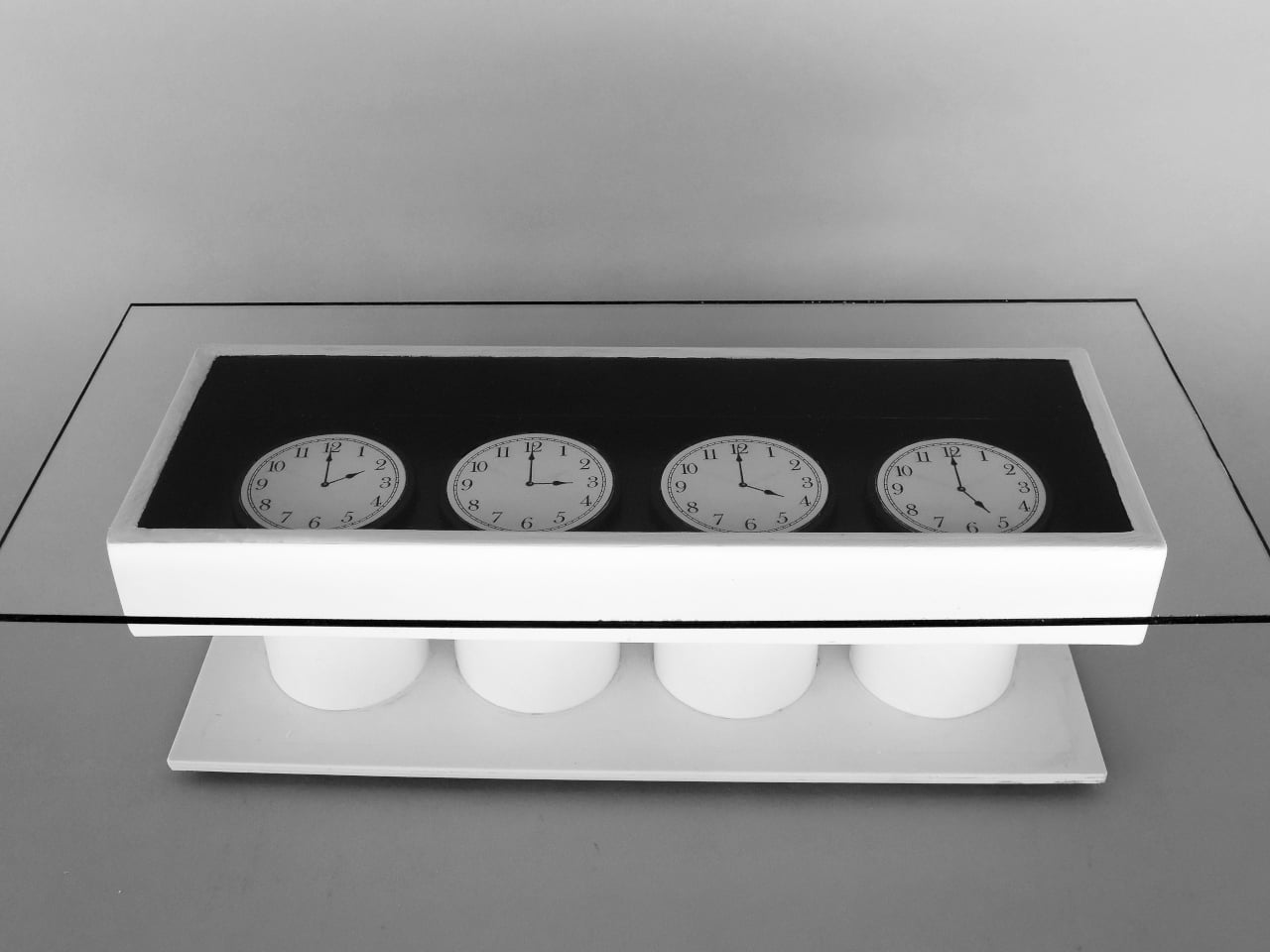 Dos piezas difundieron conciencia en todo el país. Four Times es una mesa de centro redonda con cuatro relojes, cada uno de ellos configurado en hora del Pacífico, hora de la montaña, hora central y hora del este. La línea de tiempo toma las mismas cuatro regiones y las organiza en un rectángulo largo, como las franjas horizontales de Estados Unidos. Ambos escritorios tienen sentido para un hogar o estudio que a menudo hace malabarismos con las llamadas telefónicas y los plazos entre estas áreas.