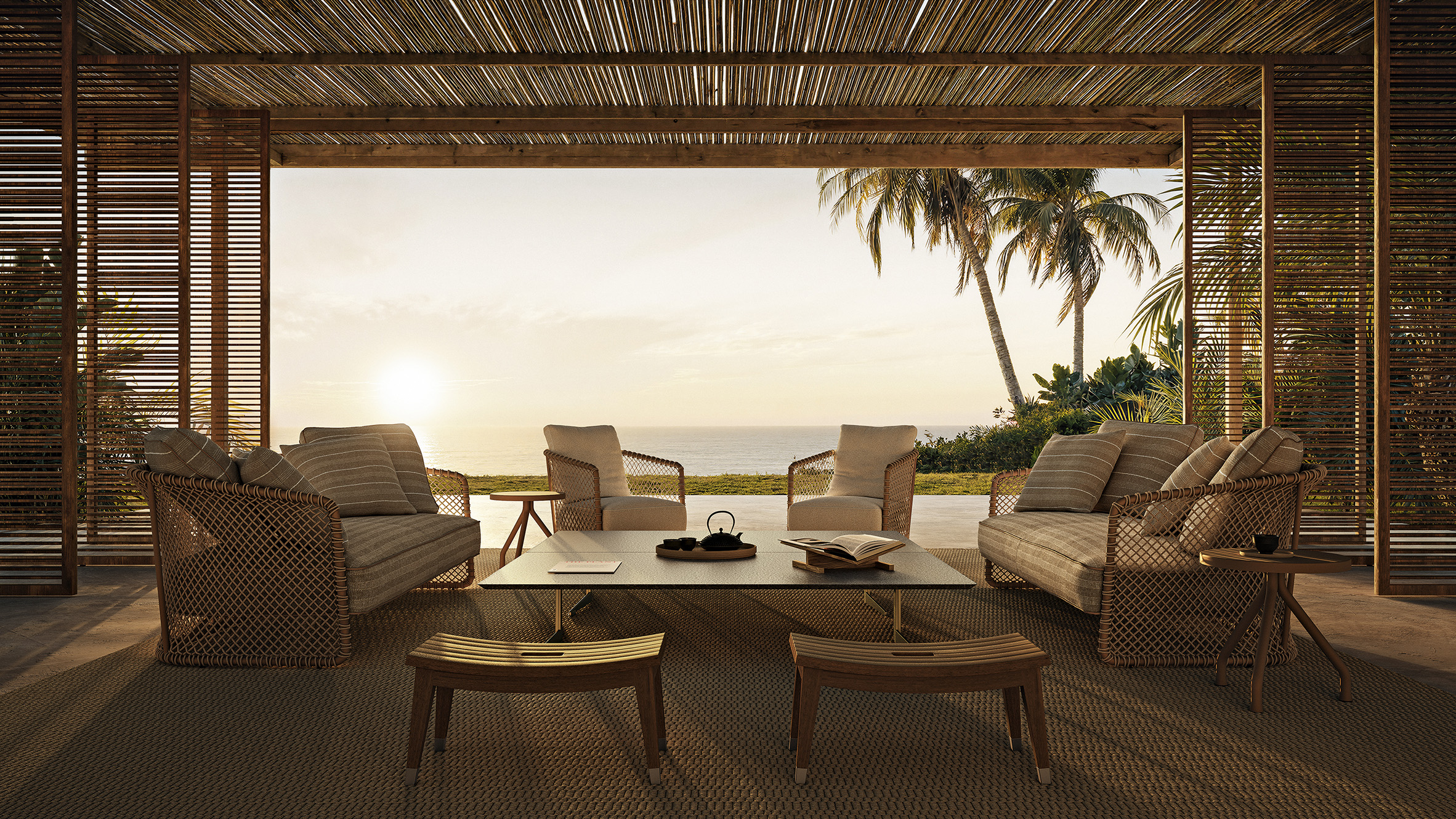 este Sistema de asientos Oasis La estructura del respaldo de malla, fabricada con hilos de polipropileno, combina el aspecto relajado y mediterráneo de los muebles tejidos con una durabilidad adecuada para las condiciones exteriores.