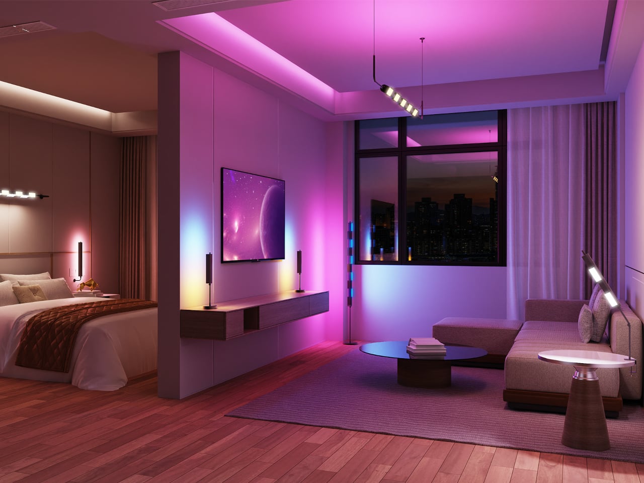 La capa de control por encima del sistema físico. Ofrece botones simples cuando estás parado junto a él, una aplicación cuando estás sentado en el sofá y control por voz a través de Alexa o Google Home cuando tienes las manos ocupadas. La aplicación te permite tratar cada bloque como su propio píxel, ajustando el brillo y el color de cada clip, o puedes confiar en 49 modos integrados de reacción de escena y música cuando solo quieres hacer que una habitación se sienta diferente con un clic.