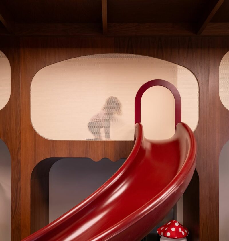 Todo está diseñado para la seguridad, desde el piso de goma hasta los esculturales escalones de espuma y los elementos de escalada y deslizamiento que activan la estructura de juego de doble nivel, donde los recortes llenos de malla brindan un lugar para que los niños se escondan y busquen en el segundo nivel.