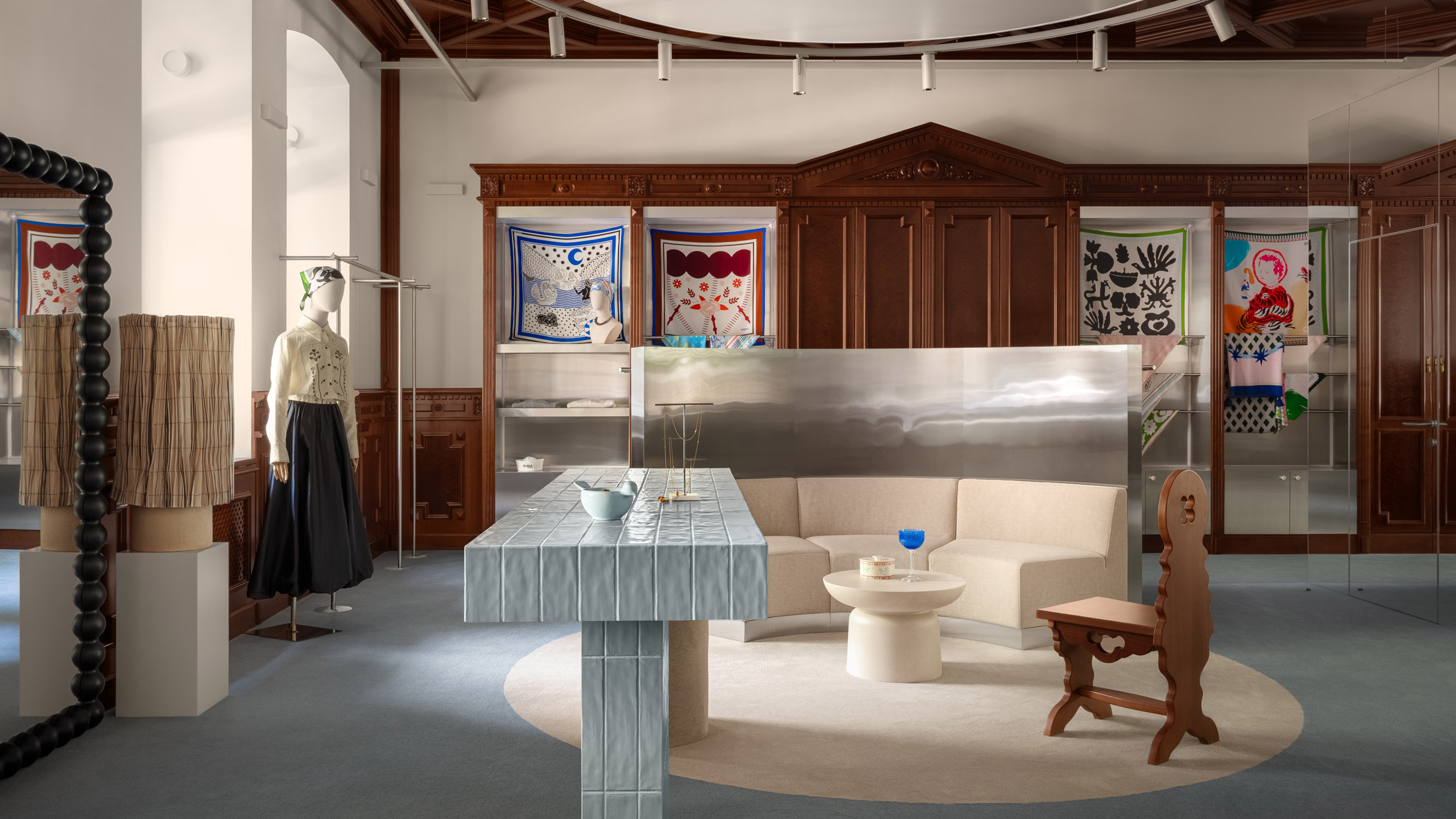 La propuesta del diseñador ofrece una serie de espacios cuidadosamente seleccionados diseñados para reflejar el enfoque de la marca para reinterpretar la artesanía tradicional ucraniana a través de una lente contemporánea.