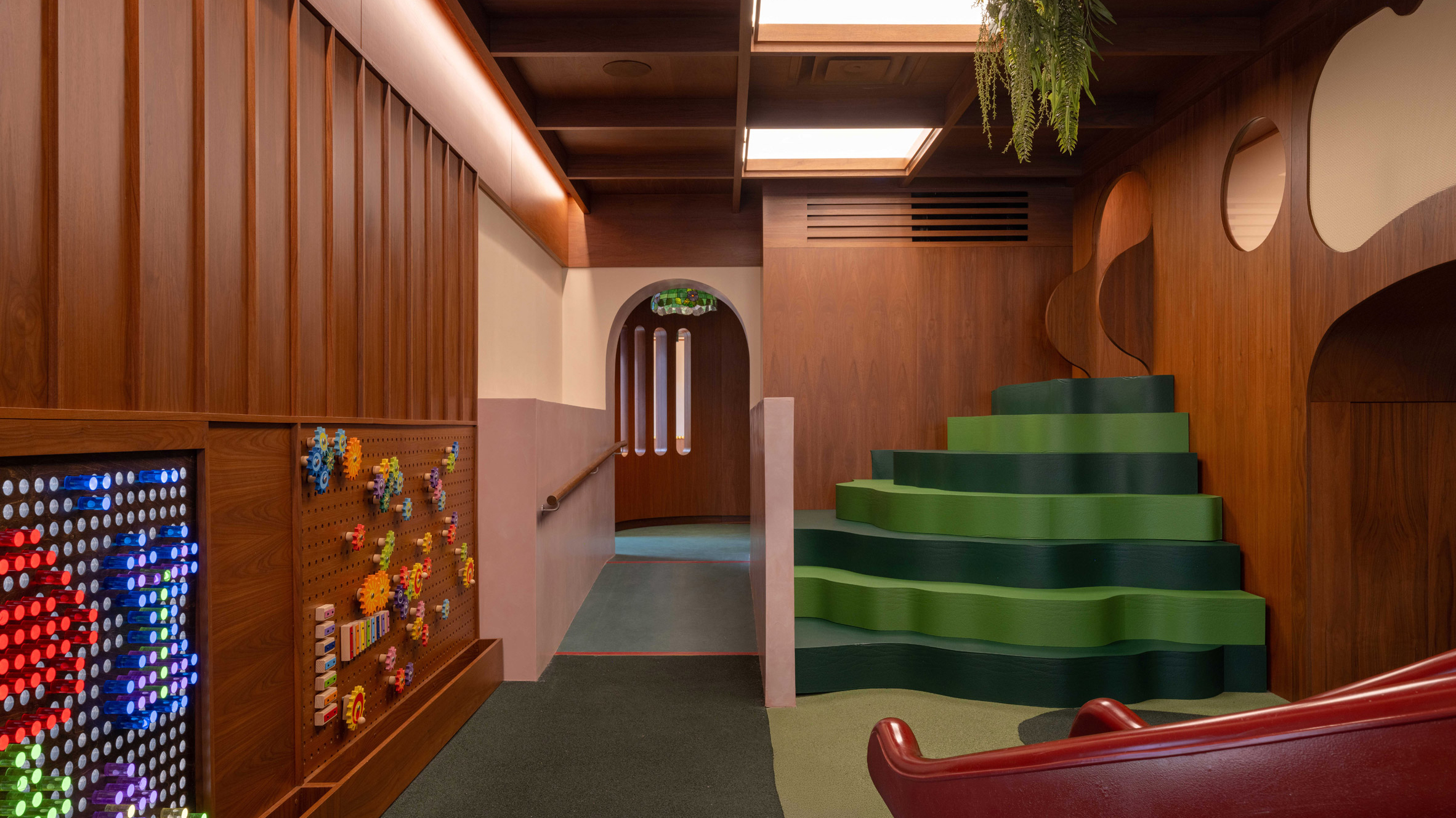 Un sauce proporciona el concepto para el área de juegos, que incluye escalones de espuma verde de dos tonos que conducen a un escondite en el entrepiso elevado y un tobogán rojo hacia abajo.