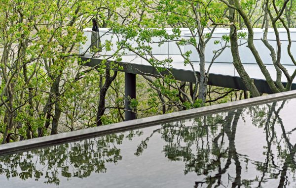 El comedor del último piso está diseñado para capturar vistas panorámicas del horizonte de Tokio manteniendo al mismo tiempo una atmósfera íntima. Los asientos personalizados complementan los tonos neutros y terrosos.