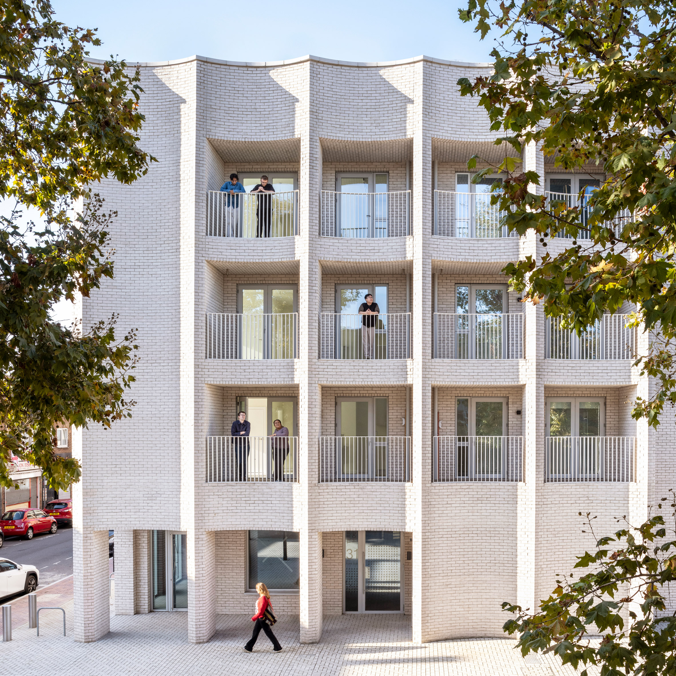 en forma de abanico frente blanco Ladrillos Con vistas a la plaza pública de Albion Street, alojamiento Calle Este Londres Diseñado por un estudio de arquitectura local. campana phillips.