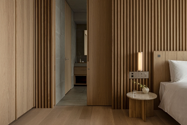 Los paneles de madera y los azulejos personalizados articulan un entorno acústico y táctil controlado. Cada superficie ha sido cuidadosamente seleccionada para que sea silenciosa y rica en materiales.