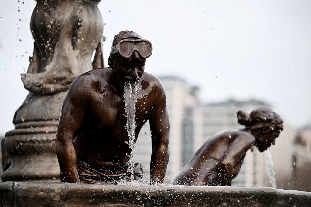 Después de conectar y pegar las piezas, instala las tuberías internas de agua, que van desde la base de cada figura hasta la boca. Las esculturas están acabadas con un revestimiento de bronce cepillado metálico pintado a mano para crear textura y variación en la superficie.