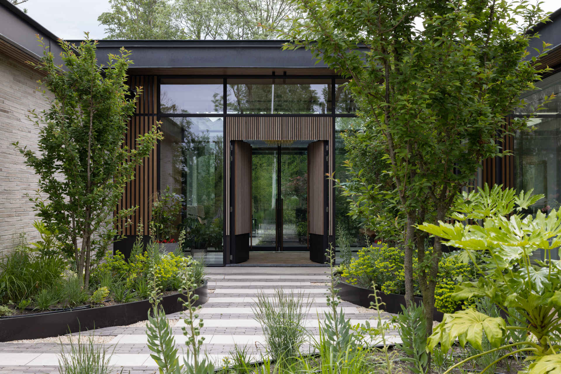 Los toldos de cobre y las persianas de madera aportan calidez y realzan el diálogo con la vegetación. Techos de fresno y revestimientos de fresno tratado térmicamente, con carpinterointroduciendo textura y profundidad.