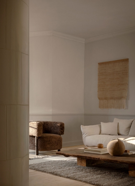 El salón cuenta con grandes puertas que conducen a una terraza elevada de madera, combinando visualmente la vida interior y exterior.