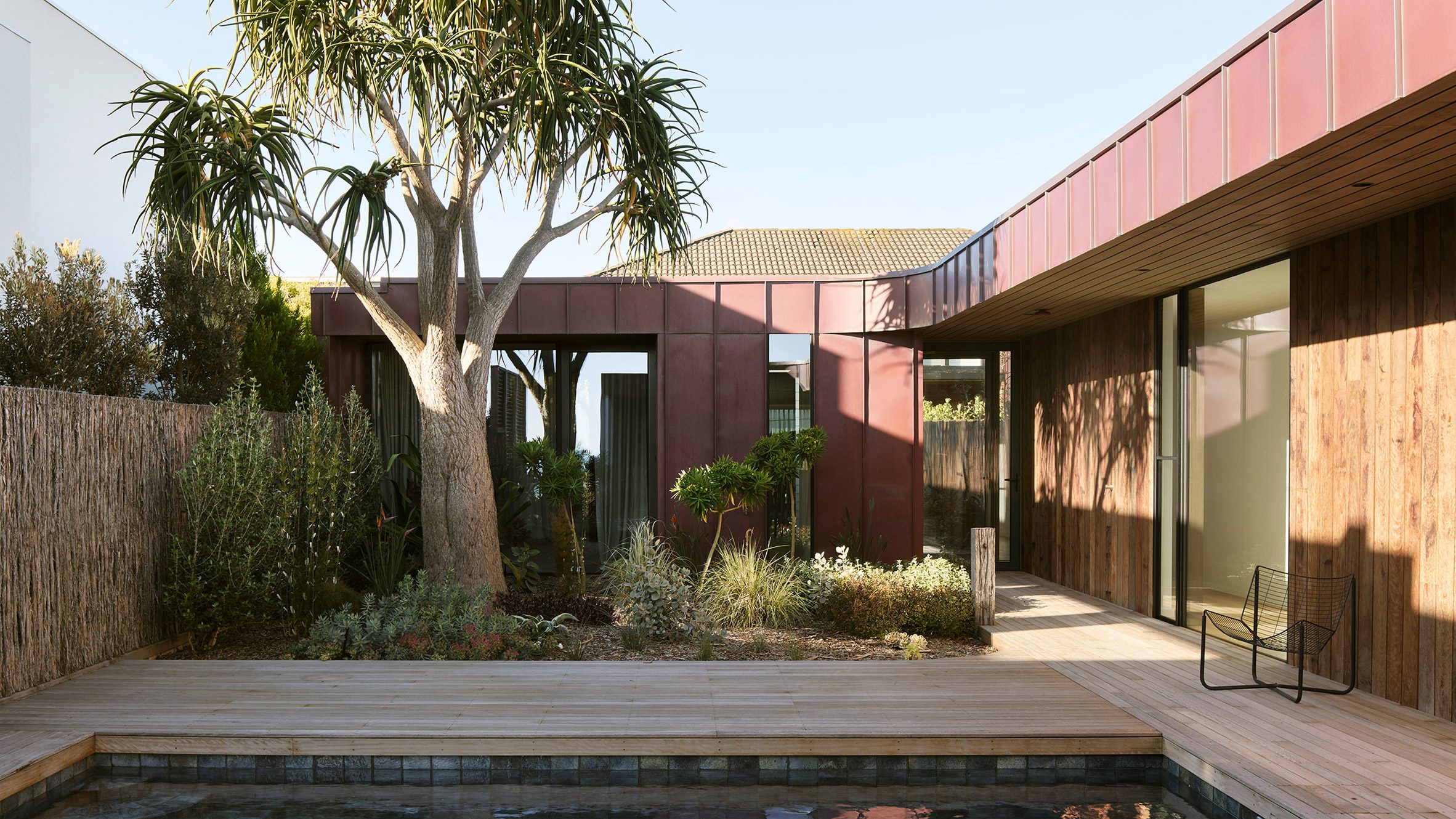 Esto impulsó la creación de un patio al oeste de la casa, rodeado por el área del dormitorio al este, que está revestida con madera y paneles de cobre oxidados para protegerlo de la brisa salada del mar.