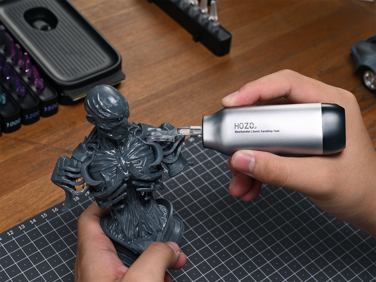 Donde las herramientas giratorias pueden dañar los detalles finos, la microlijadora de 13,000 SPM de HOZO lija limpiamente impresiones 3D y modelos en miniatura.