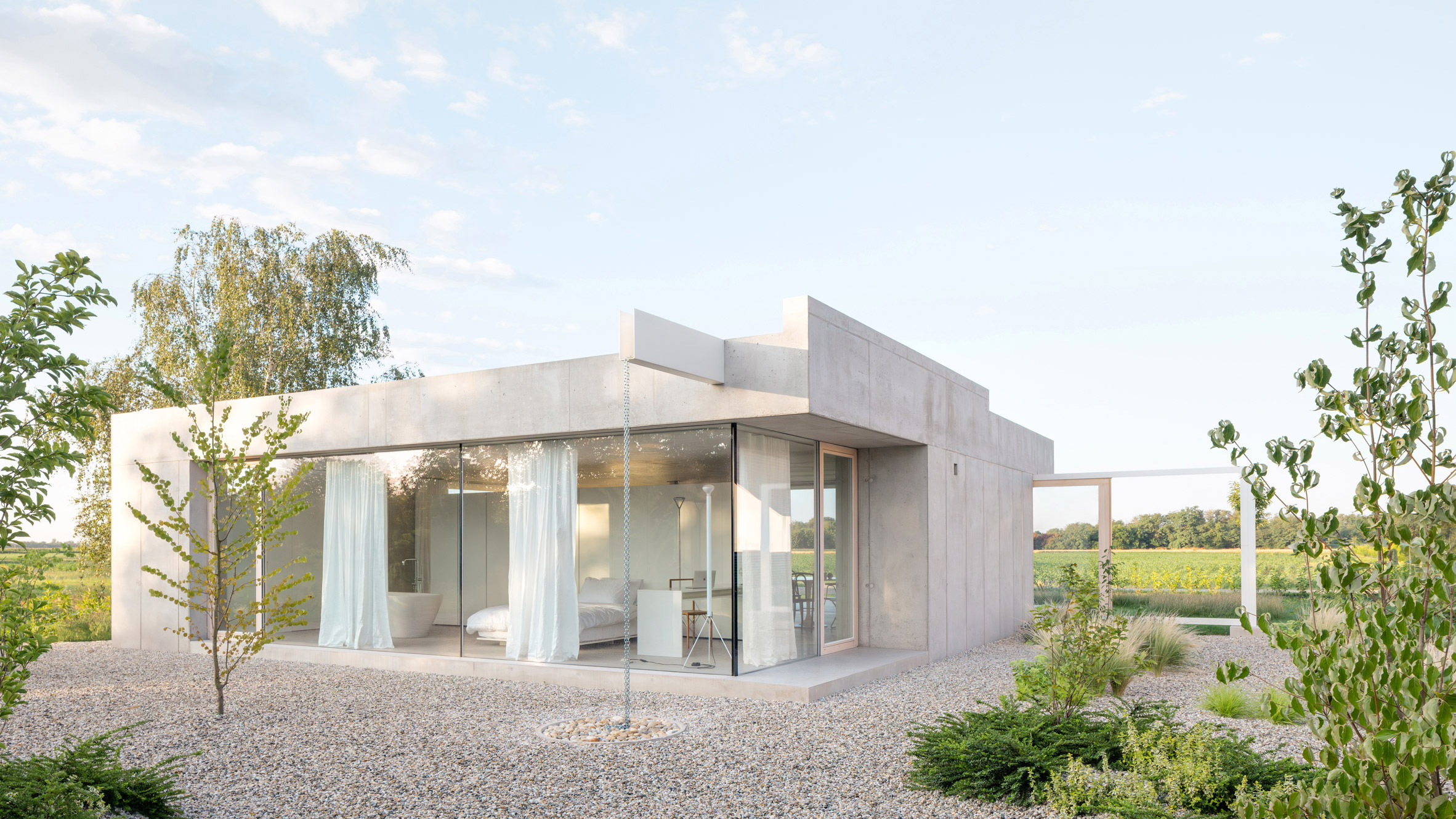“El plano de planta radicalmente abierto elimina los límites entre el interior y el exterior, mientras que la envoltura de vidrio sirve como envolvente y dispositivo de marco”, continúa Ebenspanger.
