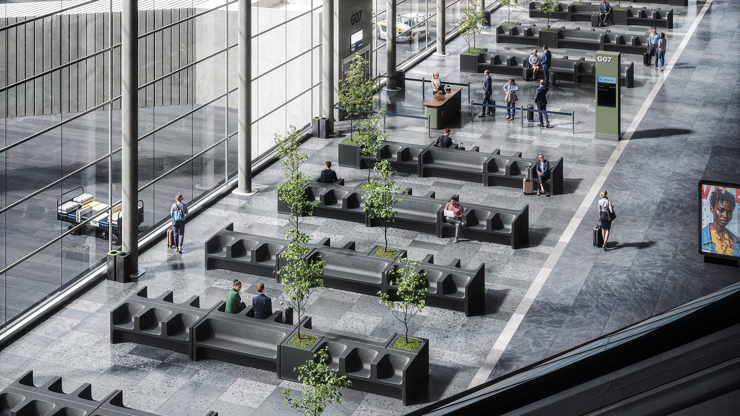 Los diseños modulares son adecuados para entornos como aeropuertos, centros de transporte y otros espacios públicos donde la comodidad a corto plazo y la facilidad de mantenimiento son clave. La versión reciclada contiene un 85 % de residuos plásticos postindustriales y presenta un acabado similar al terrazo que celebra su historia material.
