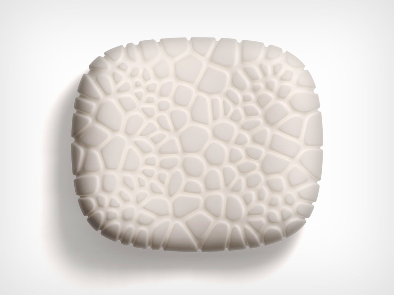El frente presenta una estructura de panal elevada que aumenta el área de contacto con la piel mientras dirige el flujo de aire. Cuatro áreas táctiles en la parte posterior brindan personalización en función de la orientación. El núcleo hueco derivado del tallo mantiene el peso total en unos 400 gramos y el volumen es aproximadamente el mismo que el de un vaso de agua. La espuma viscoelástica conserva su geometría biónica tras el uso repetido, y las partículas de goma antideslizantes de la base la mantienen estable sobre colchonetas y suelos duros. Nota: Los patrones de superficie no son adecuados para personas con tripofobia.