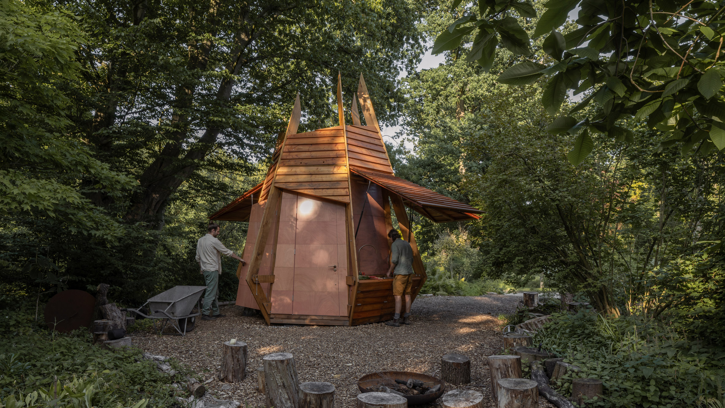 La estructura en forma de cápsula alberga almacenamiento de herramientas, lavabos, inodoros compostables y bancos. Todas estas características están ocultas detrás de tablas de madera que se abren hacia arriba para funcionar como un toldo en un pequeño claro.