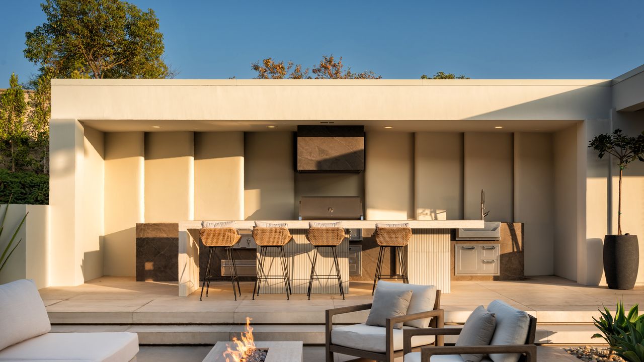 Kurc ​​​​a menudo diseña cocinas y áreas de salón como “una experiencia fluida”, enfatizando los elementos que se usan todos los días. Considere lujos funcionales como refrigeradores empotrados, máquinas de hielo y cajones calentadores, combinados con una pérgola o techo para sombra y refugio, e iluminación en capas como Candelabros de exterior, apliques de pared y faroles móviles.. Además, la calidez de una chimenea o un calentador oculto le permite extender la temporada hasta el clima cálido.