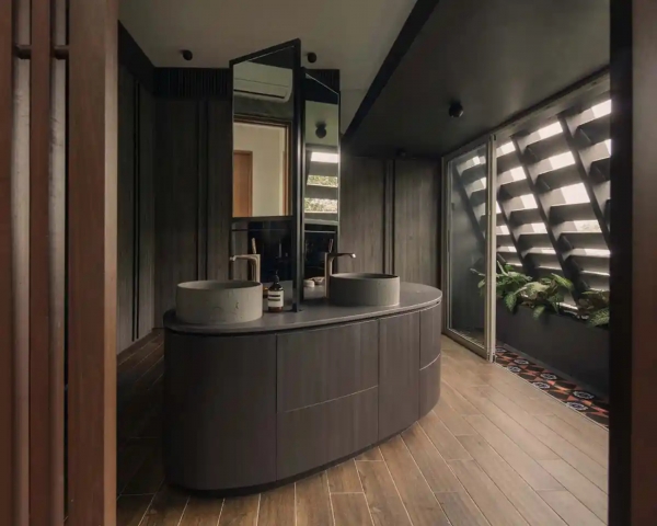 Un tocador de baño tallado ancla el espacio junto con gabinetes de madera oscura y lavabos emparejados debajo de paneles con espejos desplazados.