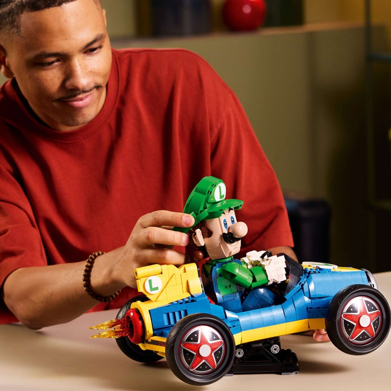 Lo que realmente obtienes aquí es impresionante. Mach 8, el vehículo icónico de Luigi de la serie Mario Kart, se está recreando en ladrillos LEGO a gran escala por primera vez, y parece el tipo de cosa que querrías poner en un estante y hacer que tus invitados se detuvieran en seco. El modelo mide más de 10 pulgadas de alto, 16 pulgadas de largo y 9 pulgadas de ancho para que no se desvanezca en el fondo. Esta no es una exhibición sutil. El kart tiene ruedas giratorias y viene con un soporte de exhibición que se puede inclinar para bloquear todo durante los derrapes, lo cual es una decisión de diseño realmente inteligente. Transforma objetos estáticos en momentos congelados, y esta diferencia marca la diferencia entre un modelo que parece atractivo y uno que realmente cuenta una historia.
