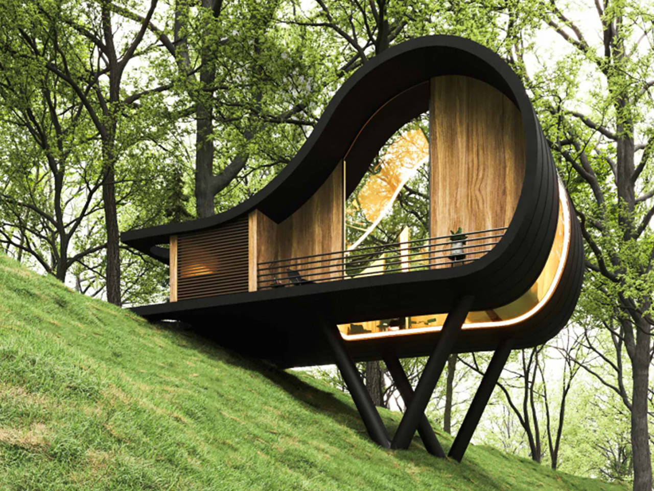 Hay una magia especial en las casas pequeñas. cabina Captándolo en una forma que parece sacada directamente de un libro de cuentos, pero firmemente arraigada en el diseño moderno. Situada en un sitio inclinado, la estructura se eleva orgánicamente desde el suelo y sus superficies se pliegan hacia arriba para dar forma al exterior y al interior. El resultado es una casa dotada de un sutil encanto hobbit que se reinterpreta a través de líneas fluidas y una arquitectura moderna. Una franja vertical de vidrio se extiende desde el suelo hasta el techo, uniendo visualmente el espacio y creando una fuerte conexión entre los niveles.