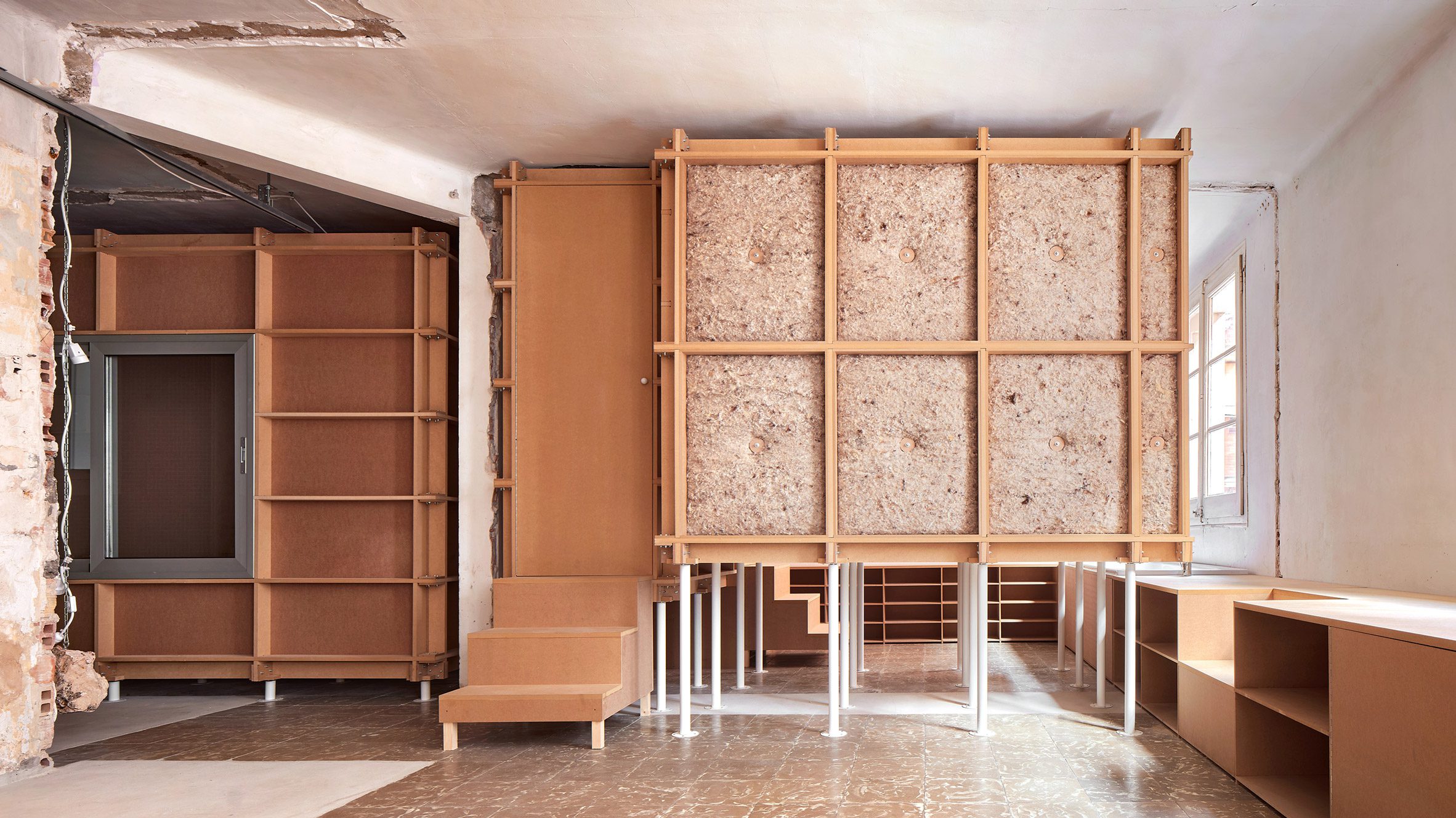 Características de carpintería sin cola y revestimiento de paredes a base de celulosa Düsseldorf El estudio de la empresa de interiorismo Urselmann Interior, utilizando Biodegradablemateriales reciclados o upcycled.