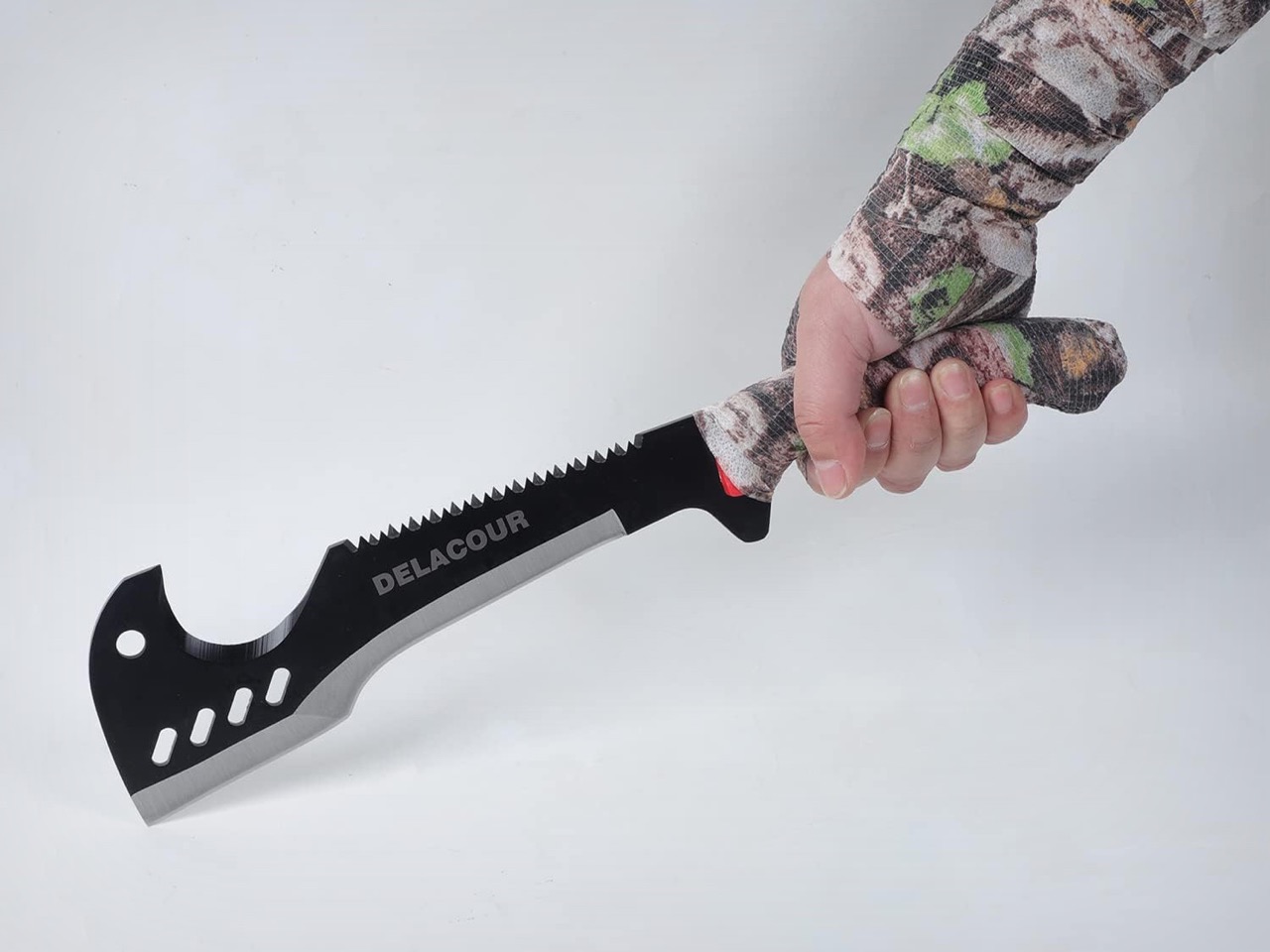 El lenguaje visual va en contra de la practicidad casera de Woodcutter’s Friend. La empuñadura de nailon rojo moldeado por inyección, con su textura y color llamativos, parece más un producto de consumo para exteriores que una herramienta de trabajo. Los agujeros en la hoja para reducir el peso añaden complejidad visual, pero no existe un principio claro de peso o equilibrio. El paquete incluye una envoltura de camuflaje, bobinas de paracord y una piedra de afilar reversible, lo que convierte al Delacour en un kit de supervivencia de nivel básico en lugar de una herramienta única bien pensada.