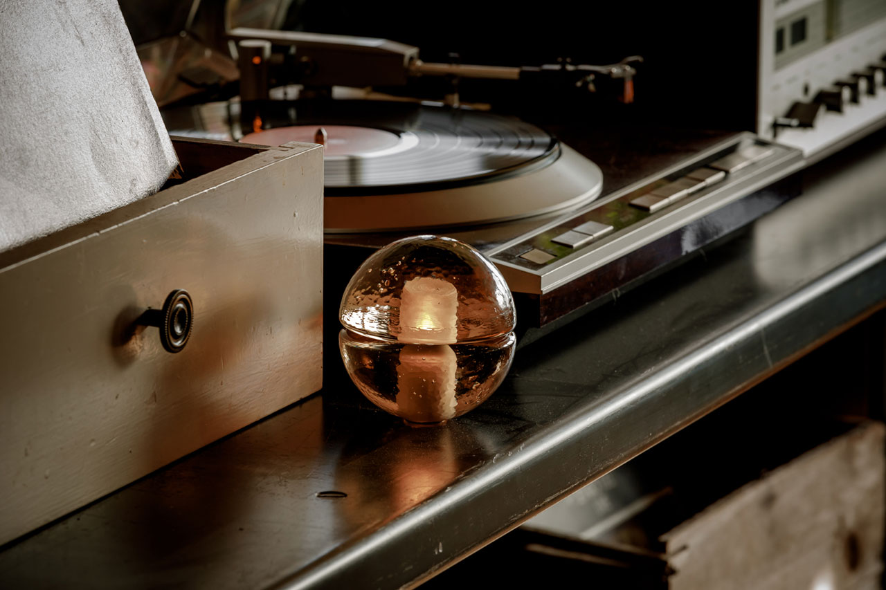 El grueso vidrio crea refracciones de luz únicas en el otro lado, mezclando y distorsionando el entorno circundante. Un cálido resplandor se extiende desde el interior y el hemisferio superior casi parece una vela de té suspendida en el borde del líquido. Las dos mitades se fusionan en el centro para formar un plano preciso sobre el que reposa la luz, creando una doble refracción que confiere a la pieza una profundidad visual inusual. Es un efecto atmosférico y riguroso, como si el objeto estuviera editando silenciosamente el espacio que lo rodea.