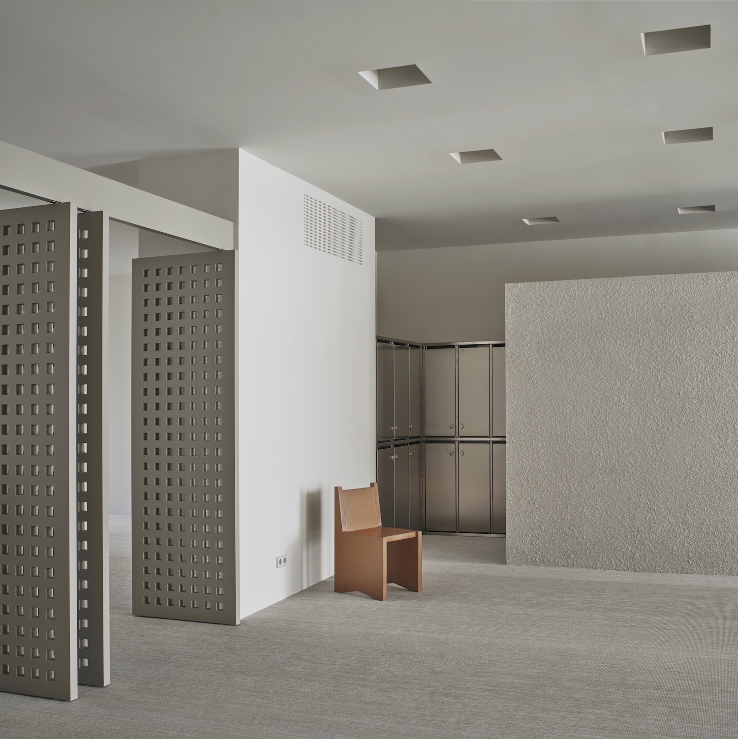 La puerta giratoria perforada es el elemento innovador más formal del proyecto. Actúan como separadores de ambientes y filtros solares, proyectando patrones de sombras geométricas en constante cambio en el suelo a medida que la luz del día los atraviesa. El edificio se convierte en una especie de reloj de sol, que registra el paso del tiempo a través de una geometría proyectada: un gesto silencioso y profundo en una instalación dedicada a la memoria y la experiencia del tiempo. Esta relación calibrada entre estructura y luz recuerda el interés de Carlo Scarpa por animar superficies a través del cambio temporal, aunque aquí el efecto se logra a través de materiales industriales y movimiento mecánico en lugar de mosaicos y teselados.