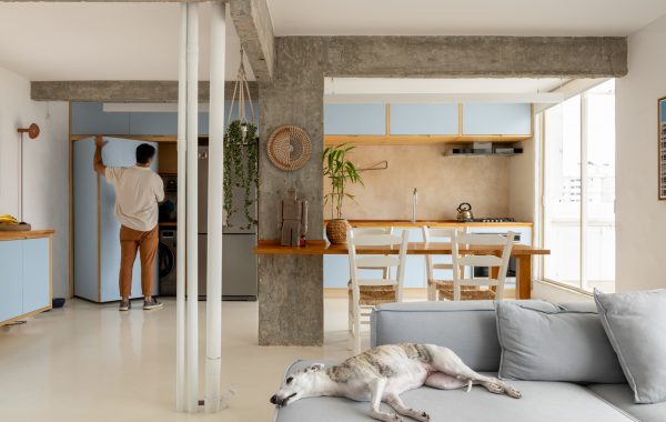 Dentro del hotel, la cocina se encuentra justo fuera de la entrada. Las paredes y los gabinetes blancos crean un telón de fondo limpio, mientras que los pisos de roble blanco aserrados agregan calidez bajo los pies. Los adornos de acero negro aportan contraste y estructura silenciosa a la habitación.