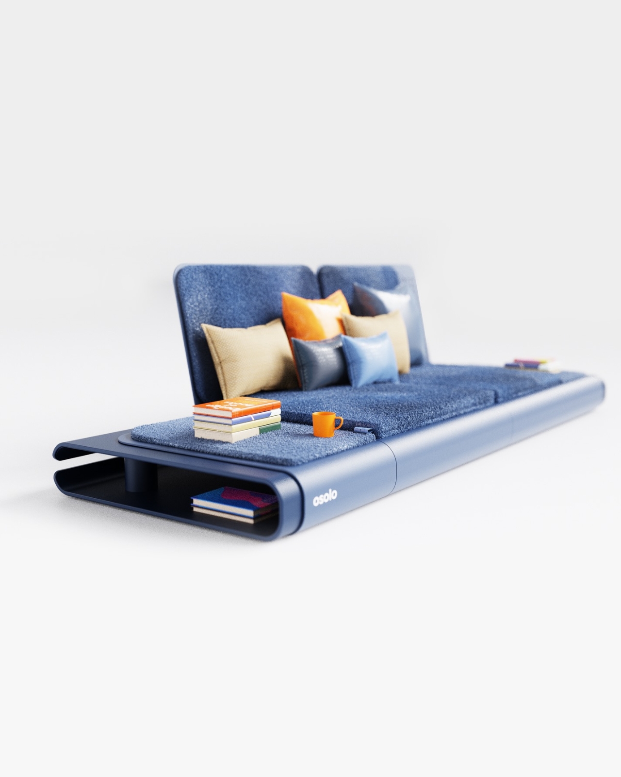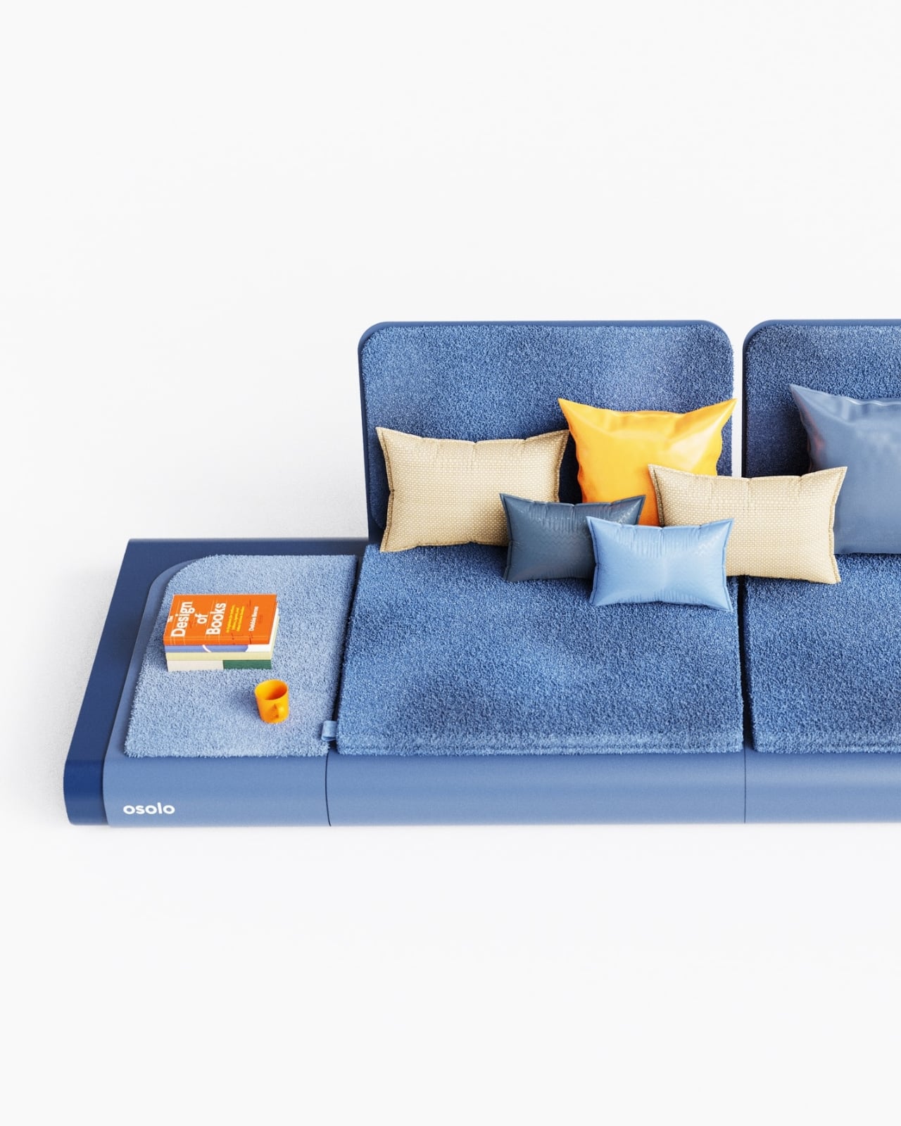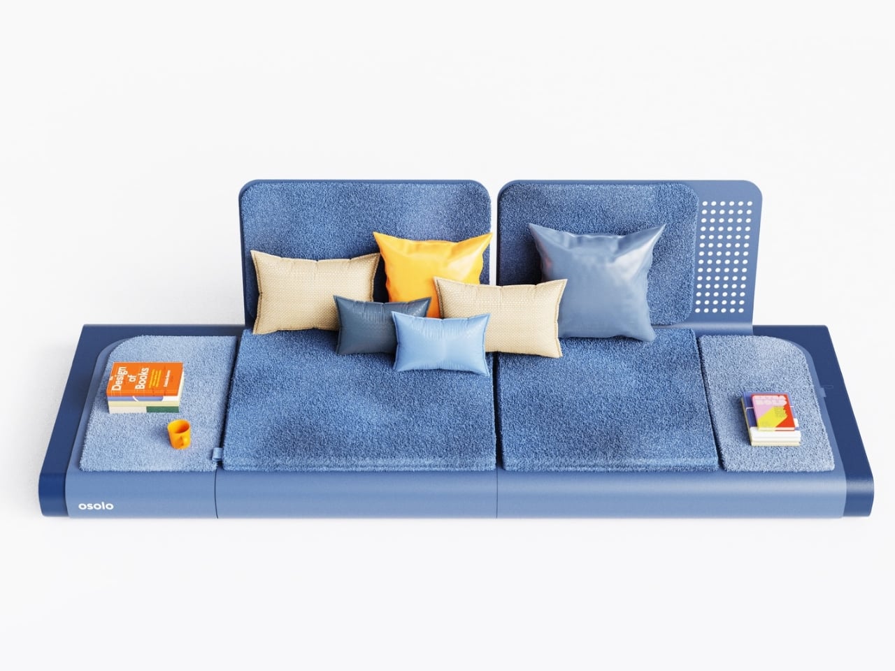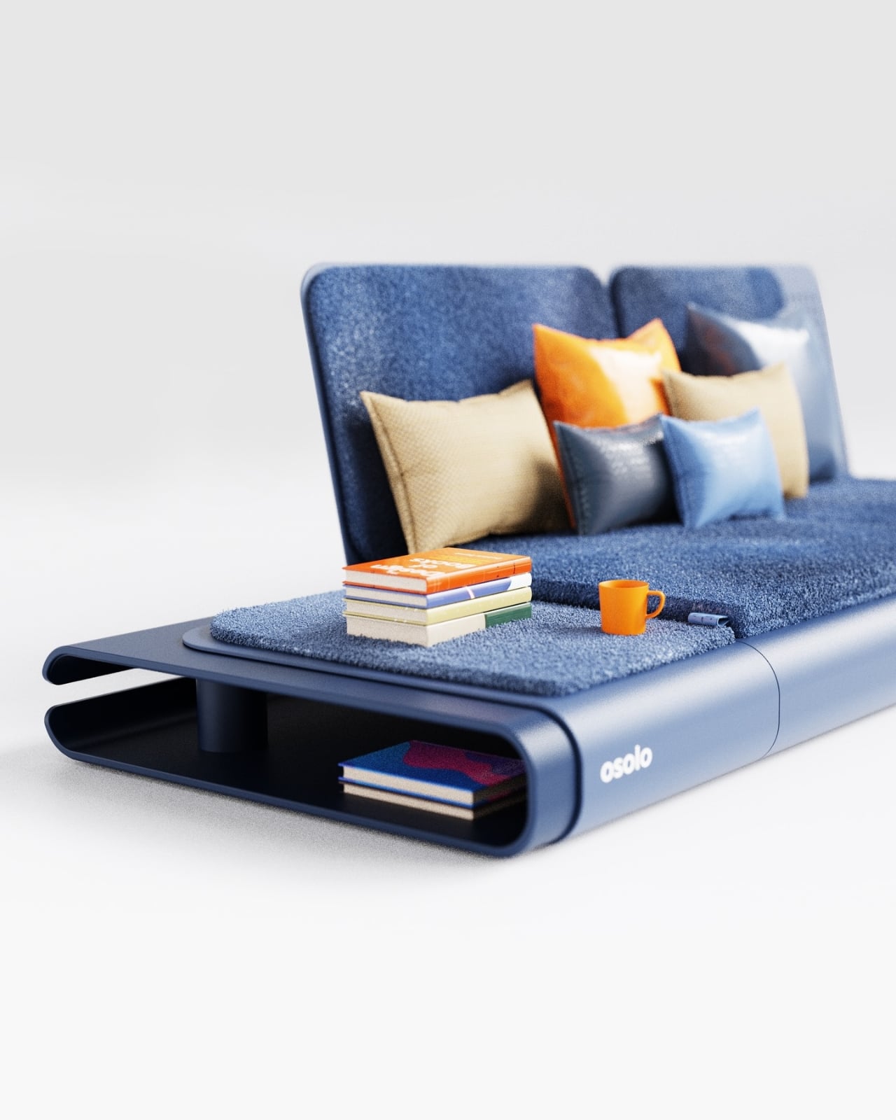 Mi sincera opinión es que el verdadero logro aquí son las limitaciones visuales. Las representaciones muestran una superficie azul oscuro, lo cual es una buena elección ya que amplifica cuán limpia y resuelta es realmente la geometría. Los bordes metálicos plegados son lisos y no complicados. El respaldo modular tiene suficiente textura superficial para romper lo que de otro modo podría fácilmente inclinarse y estructurarse. Los cojines dispersos en naranja, tostado y azul plateado añaden calidez sin suavizar la claridad de la estructura debajo de ellos. Con una pila de libros y una taza de café en la plataforma, parecían como en casa. Esto es probablemente lo más honesto que puede mostrarle una representación de un producto.